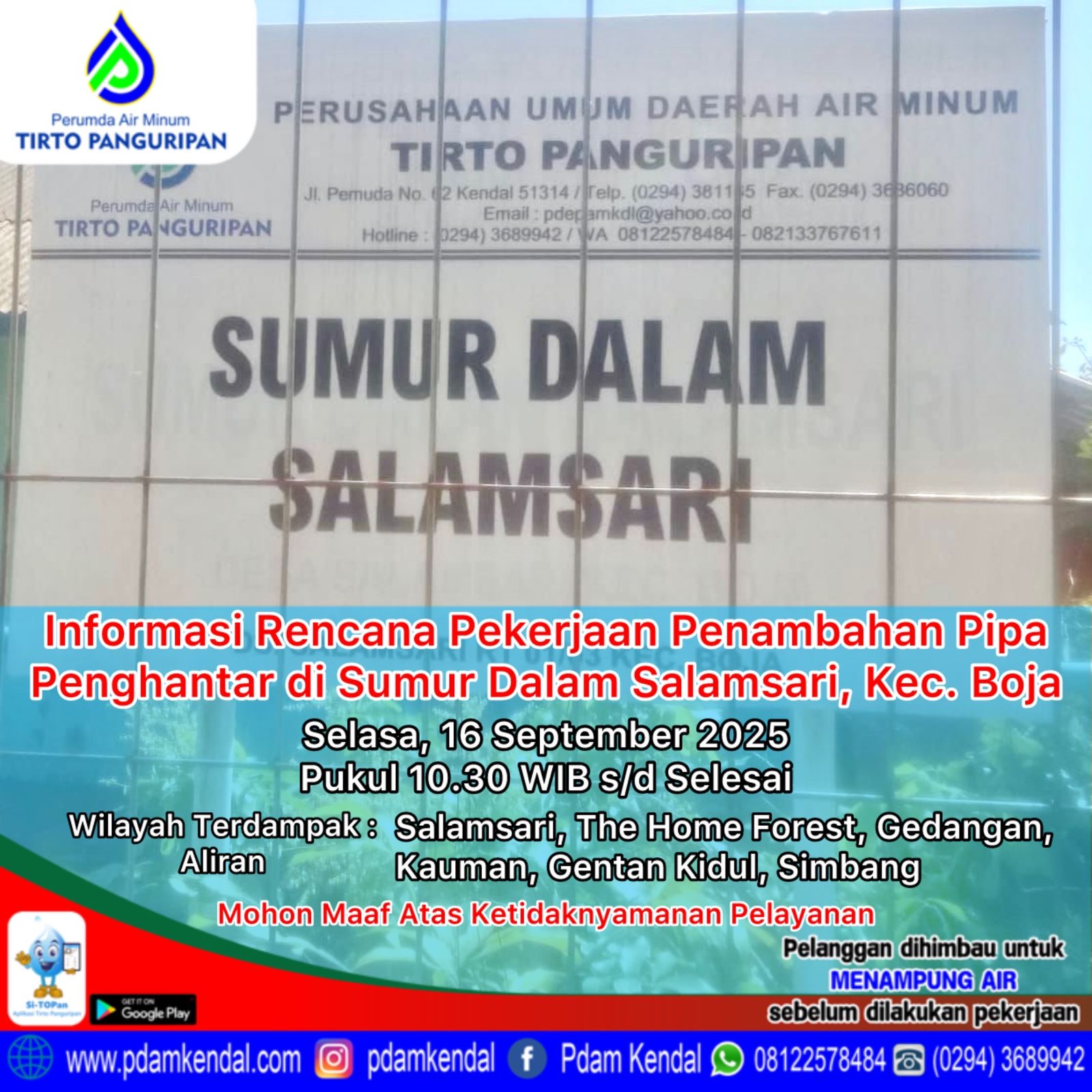 Informasi Rencana Pekerjaan Penambahan Pipa Penghantar di Sumur Dalam Salamsari, Kec. Boja. Selasa, 16 September 2025 pukul 10.30 WIB s/d selesai Hal tersebut akan menyebabkan aliran dan kualitas air terganggu