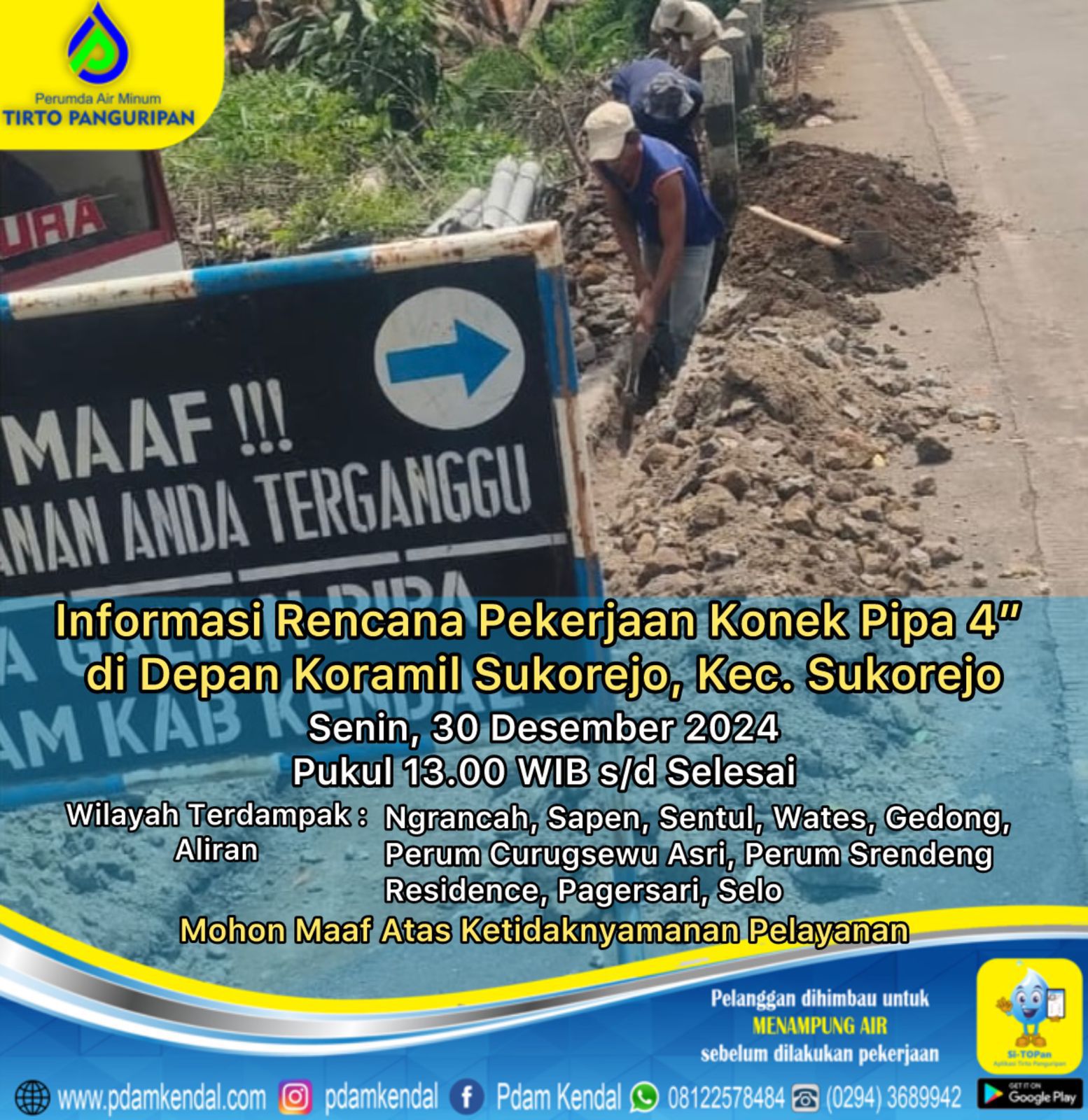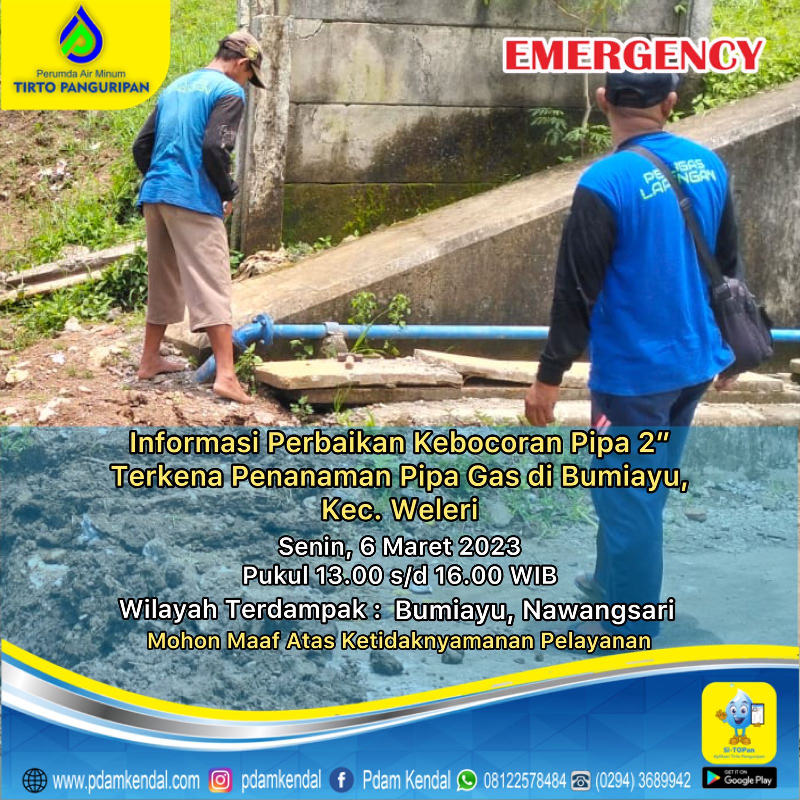 Sehubungan adanya perbaikan pipa 8" Belakang Pasar Pagi Kaliwungu Menyebabkan aliran terganggu di wilayah seluruh perumahan sebelah utara Pasar Pagi Kaliwungu dan Sumberjo