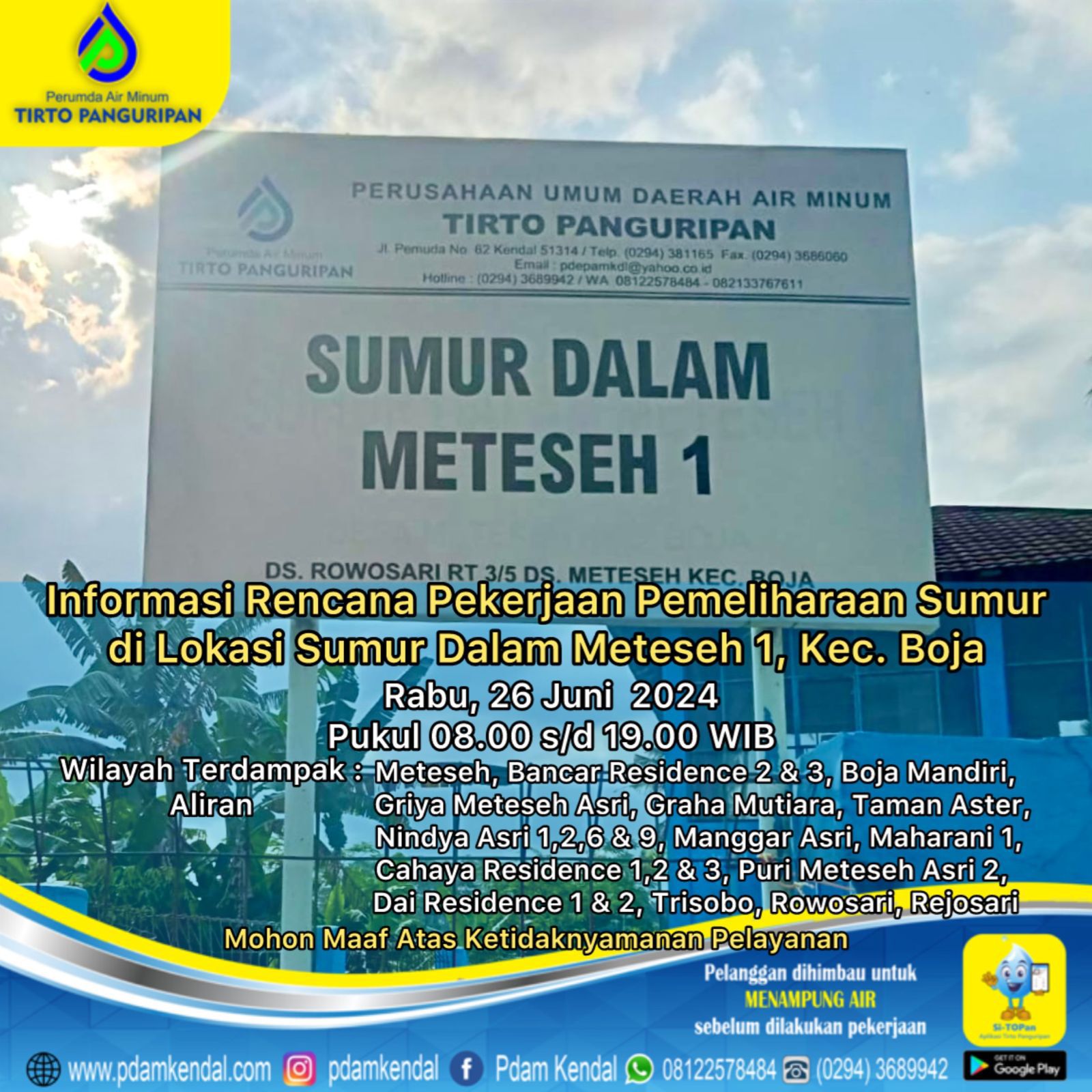 Informasi Rencana Pekerjaan Pemeliharaan di Sumur Dalam Purwokerto, Kec. Patebon. Rabu, 1 Oktober 2025 pukul 09.00 WIB s/d selesai Hal tersebut akan menyebabkan aliran dan kualitas air terganggu