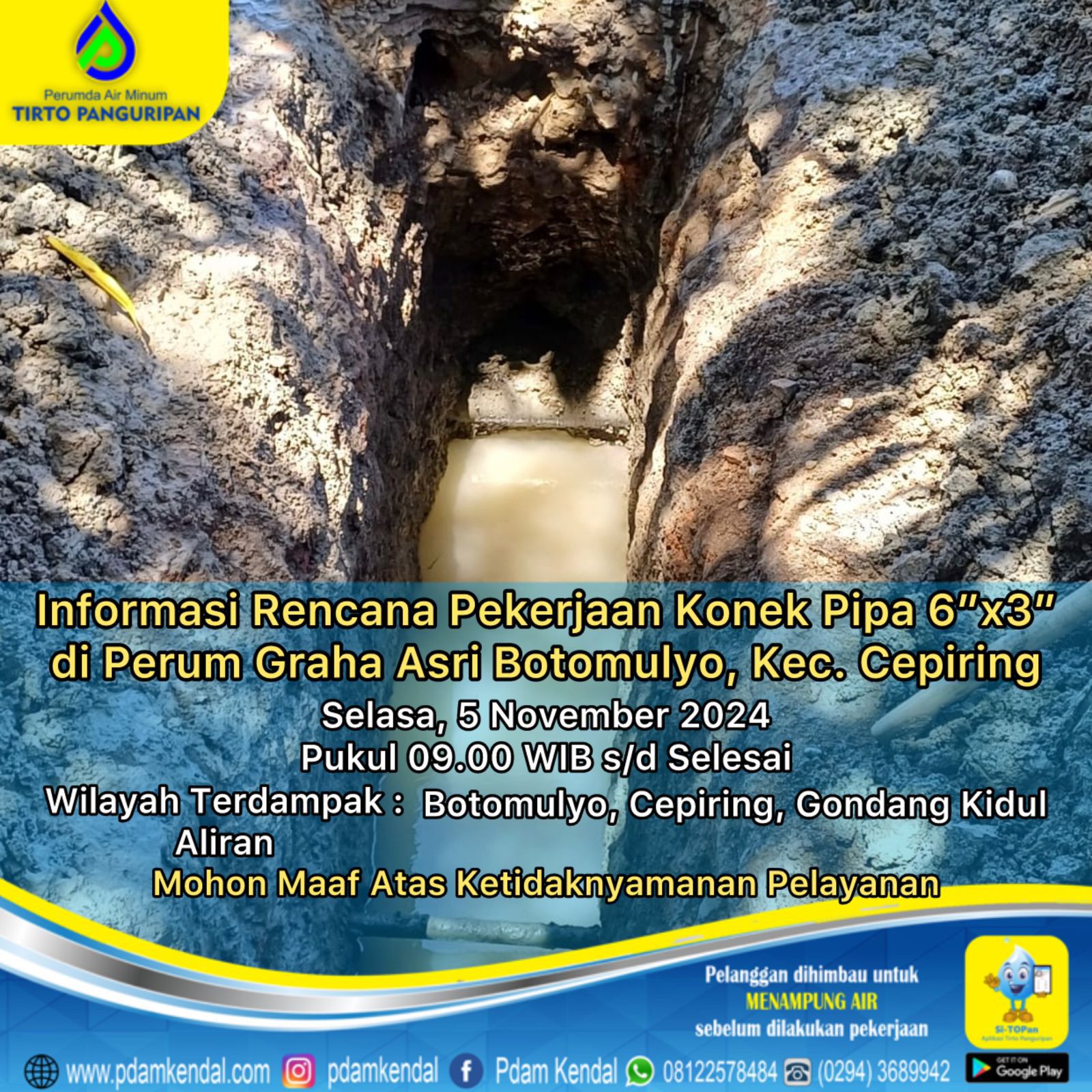 Informasi Rencana perbaikan Kebocoran Pipa 3" di Jl. Kramat Samping Mushola Kapal, Kec. Kaliwungu Senin, 21 Juli 2025 pukul 13.00 WIB s/d selesai Hal tersebut akan menyebabkan aliran dan kualitas air terganggu