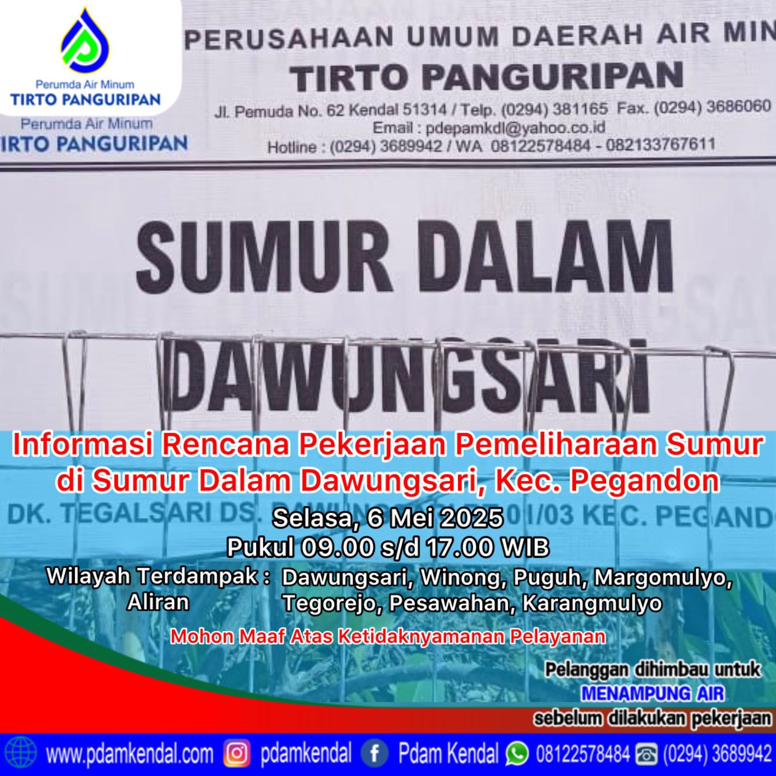 Informasi Rencana Pekerjaan Pemeliharaan Sumur di Sumur Dalam Magelung 2, Kec. Kaliwungu Selatan. Senin, 8 September 2025 pukul 19.00 WIB s/d Rabu, 10 September 2025 pukul 19.00 WIB Hal tersebut akan menyebabkan aliran dan kualitas air terganggu