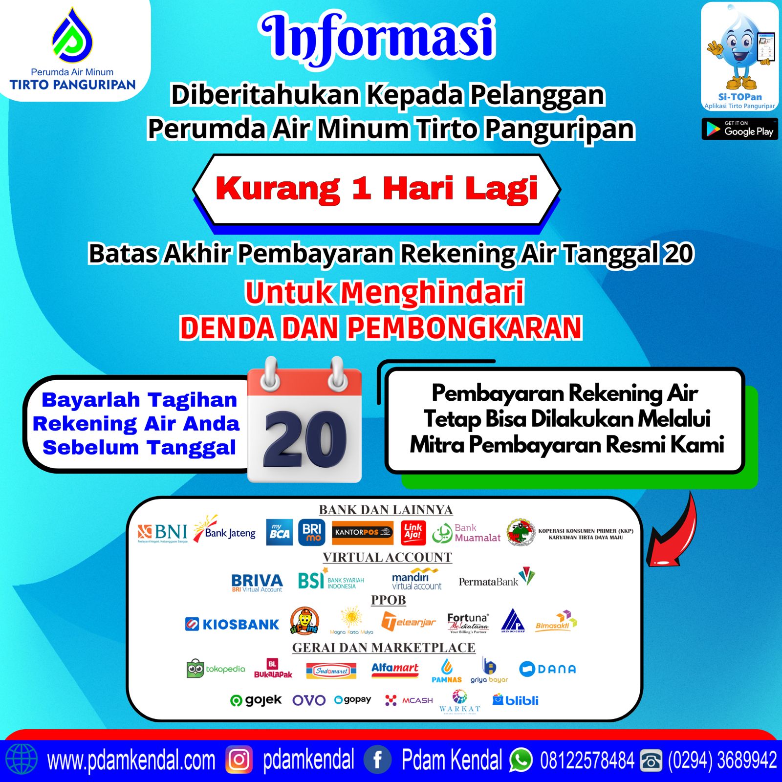 Pelanggan Yth, Kurang 1 hari lagi. Batas akhir pembayaran rekening air tanggal 20. Untuk menghindari denda dan pembongkaran, silahkan bayar rekening air sebelum tanggal 20. Pembayaran rekening air. Tetap bisa dilakukan. Melalui mitra pembayaran resmi k