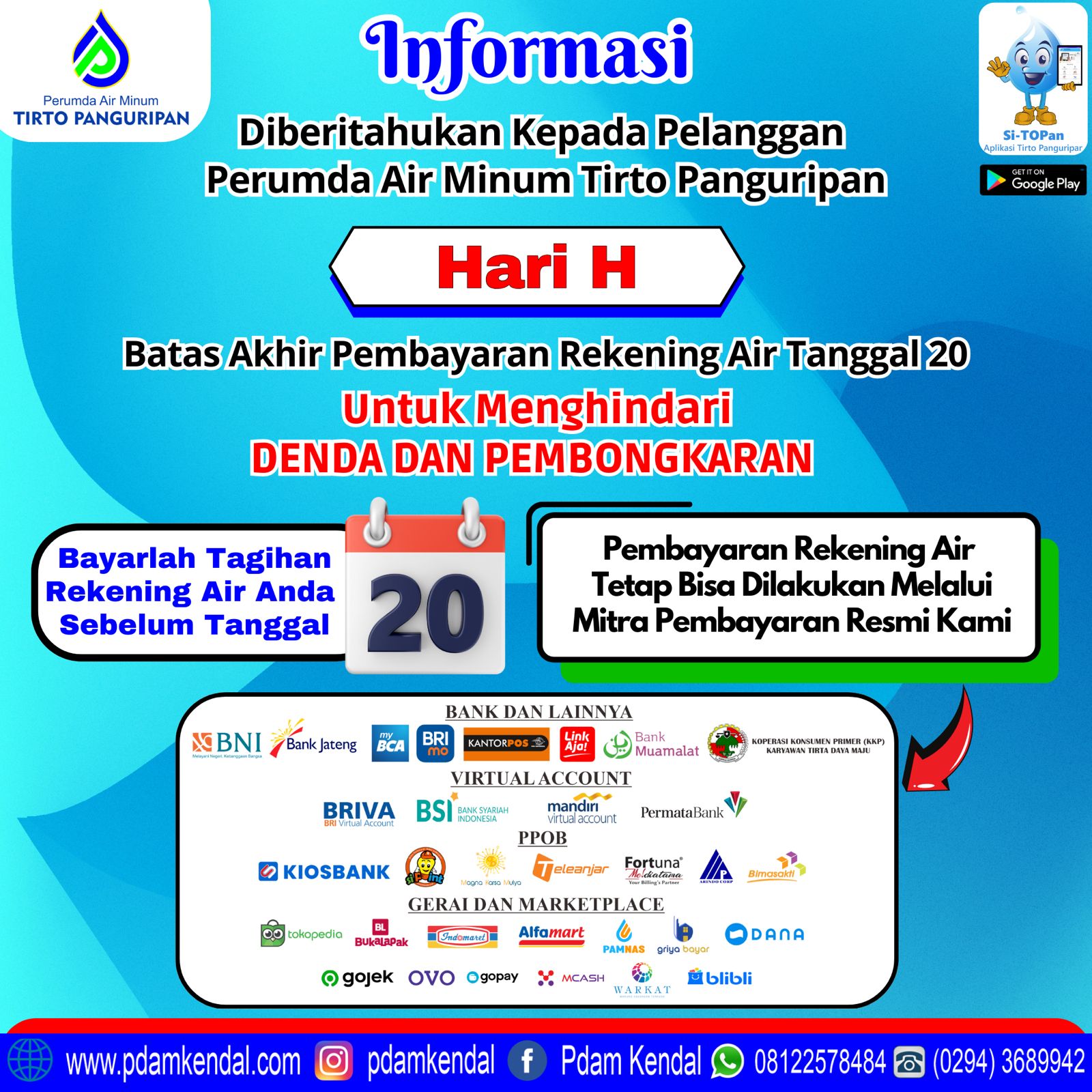 Pelanggan Yth, Hari ini, batas akhir pembayaran rekening air tanggal 20. Untuk menghindari denda dan pembongkaran, silahkan bayar rekening air sebelum tanggal 20. Pembayaran rekening air. Tetap bisa dilakukan. Melalui mitra pembayaran resmi kami. Info