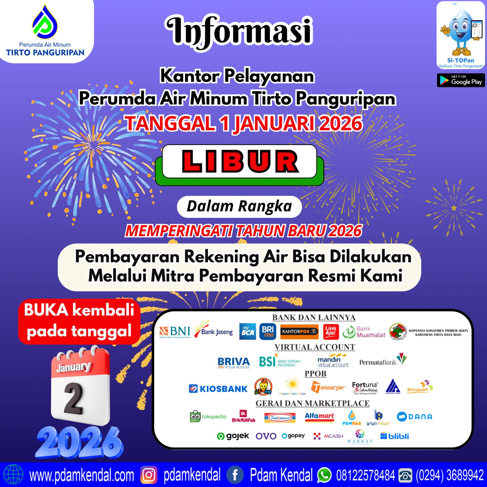 Kantor Pelayanan Perumda Air Minum Tirto Panguripan Tanggal 1 Januari 2026 LIBUR Dalam rangka memperingati Tahun Baru 2026. Info atau pengaduan dapat menghubungi nomor WA Pengaduan kami 08122578484.