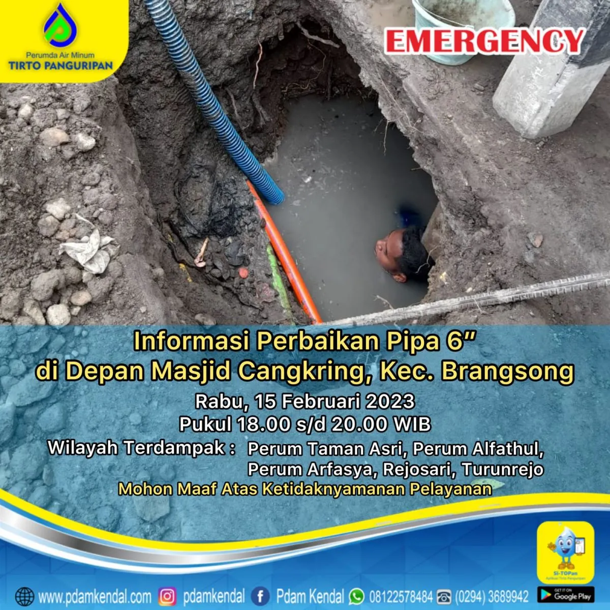 Informasi perbaikan kebocoran pipa 6" di depan masjid Cangkring, Kec. Brangsong