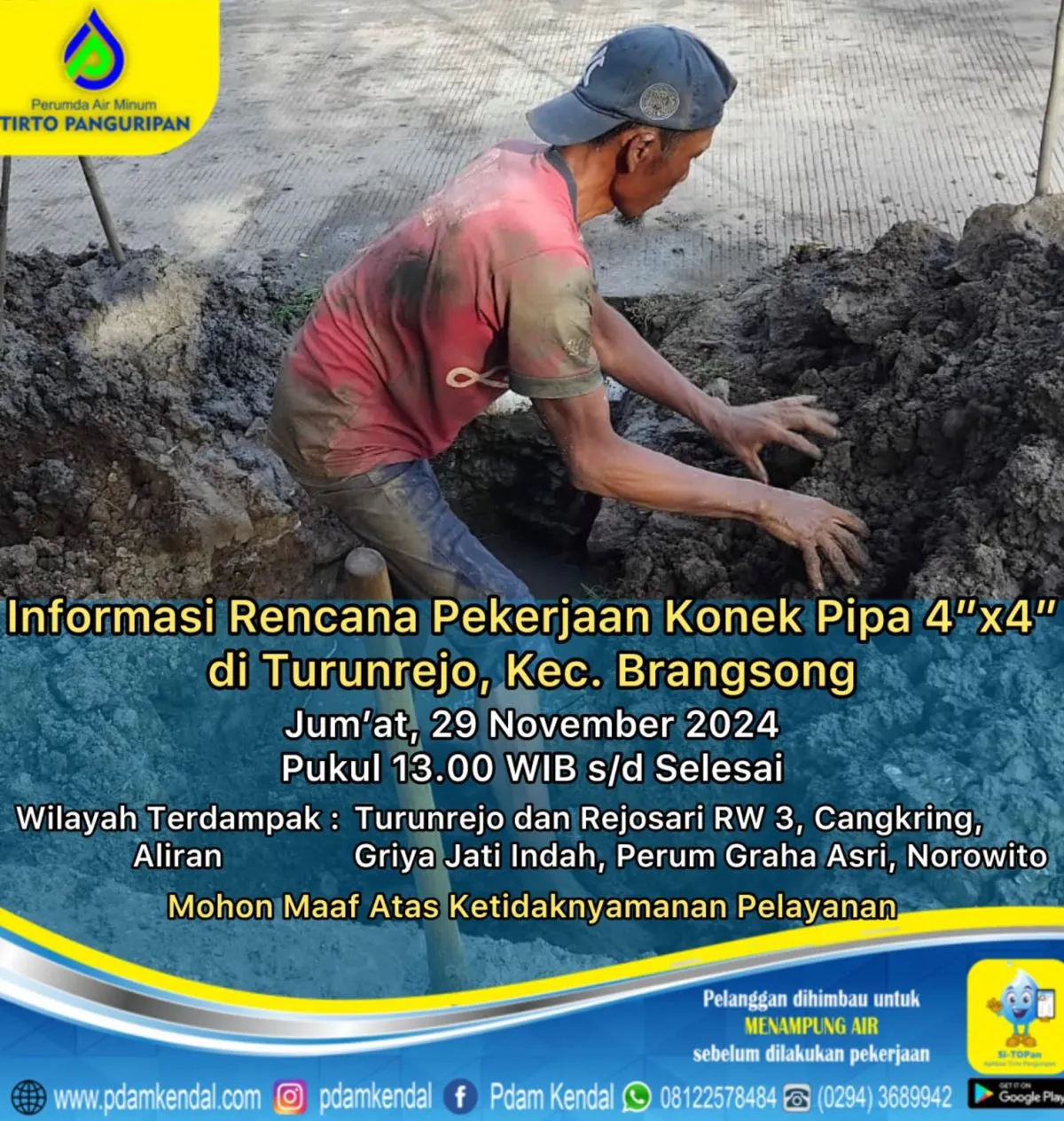 Informasi rencana pekerjaan konek pipa 4”x4” di Turunrejo, Kec. Brangsong.