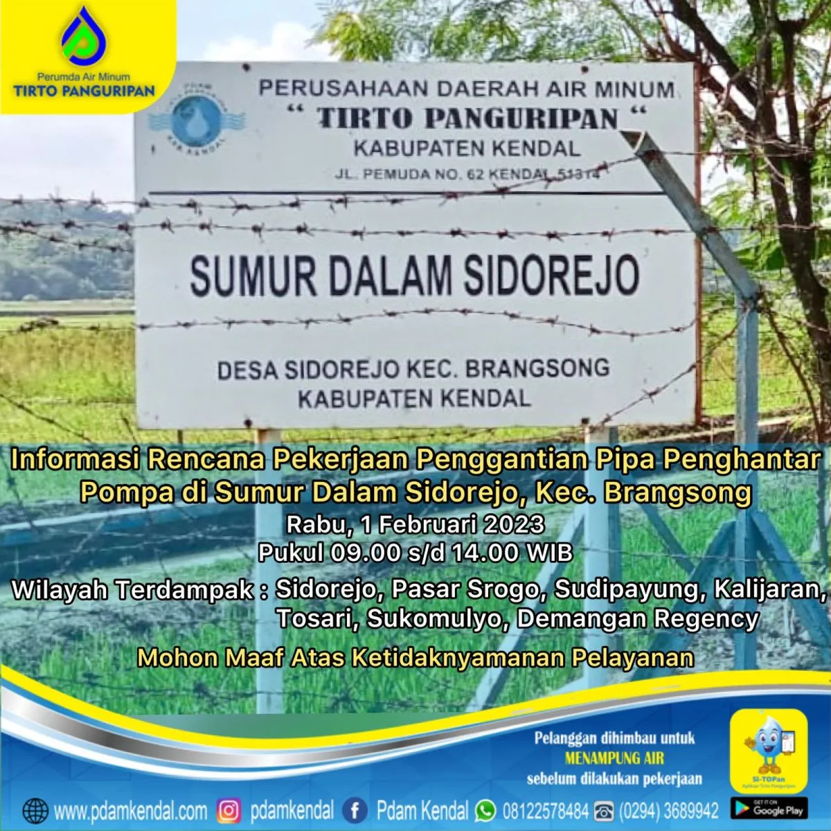 Informasi rencana pekerjaan penggantian pipa penghantar pompa di Sumur Dalam Sidorejo, Kec. Brangsong