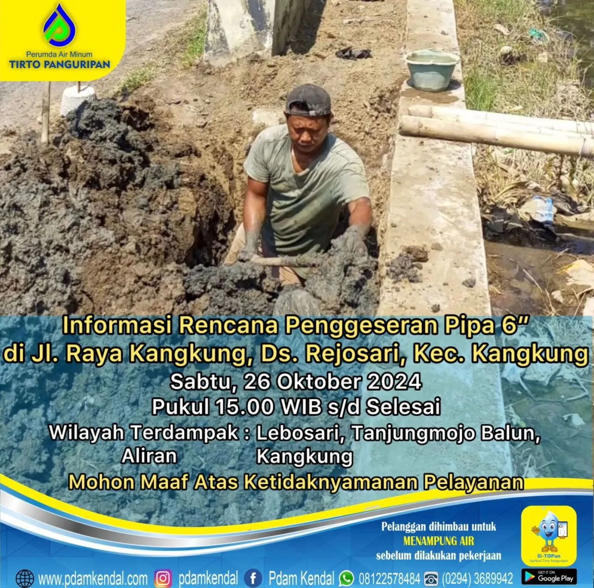 Informasi rencana penggeseran pipa 6” di Jl. Raya Kangkung, Ds. Rejosari, Kec. Kangkung.