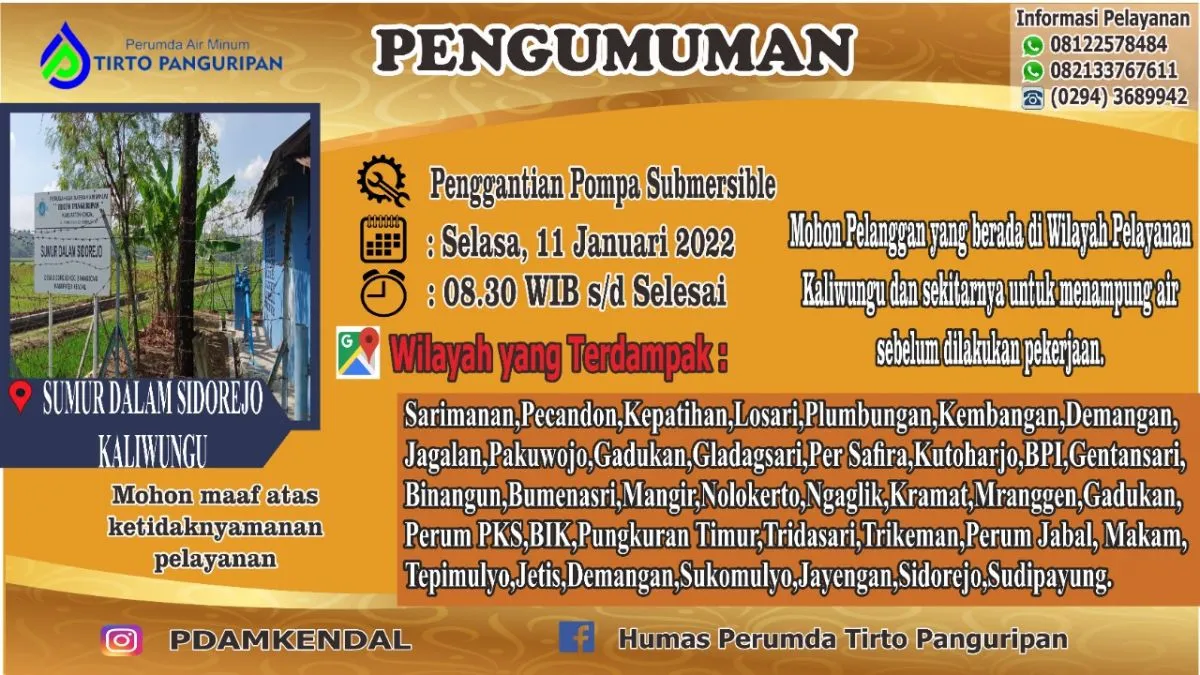 Sehubungan akan dilakukan pekerjaan penggantian pompa submersible di Sumur Dalam Sidorejo pada hari Selasa, 11 Januari 2022 jam 08.30 WIB sampai dengan selesai yang mengakibatkan gangguan aliran air.