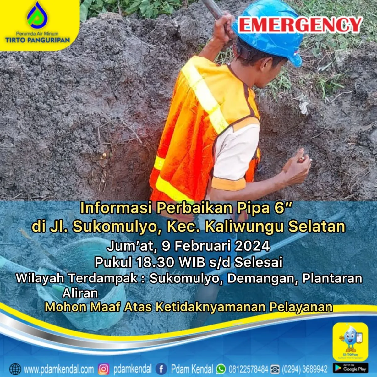 Informasi perbaikan pipa 6” di Jl. Sukomulyo, Kec. Kaliwungu Selatan.
