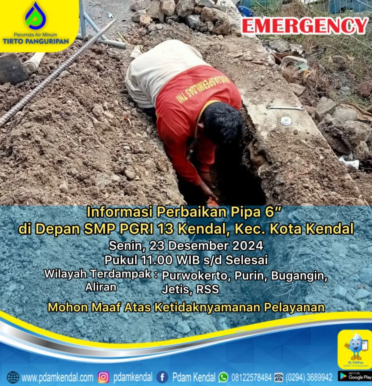 Informasi perbaikan pipa 6” di depan SMP PGRI 13 Kendal, Kec. Kota Kendal.