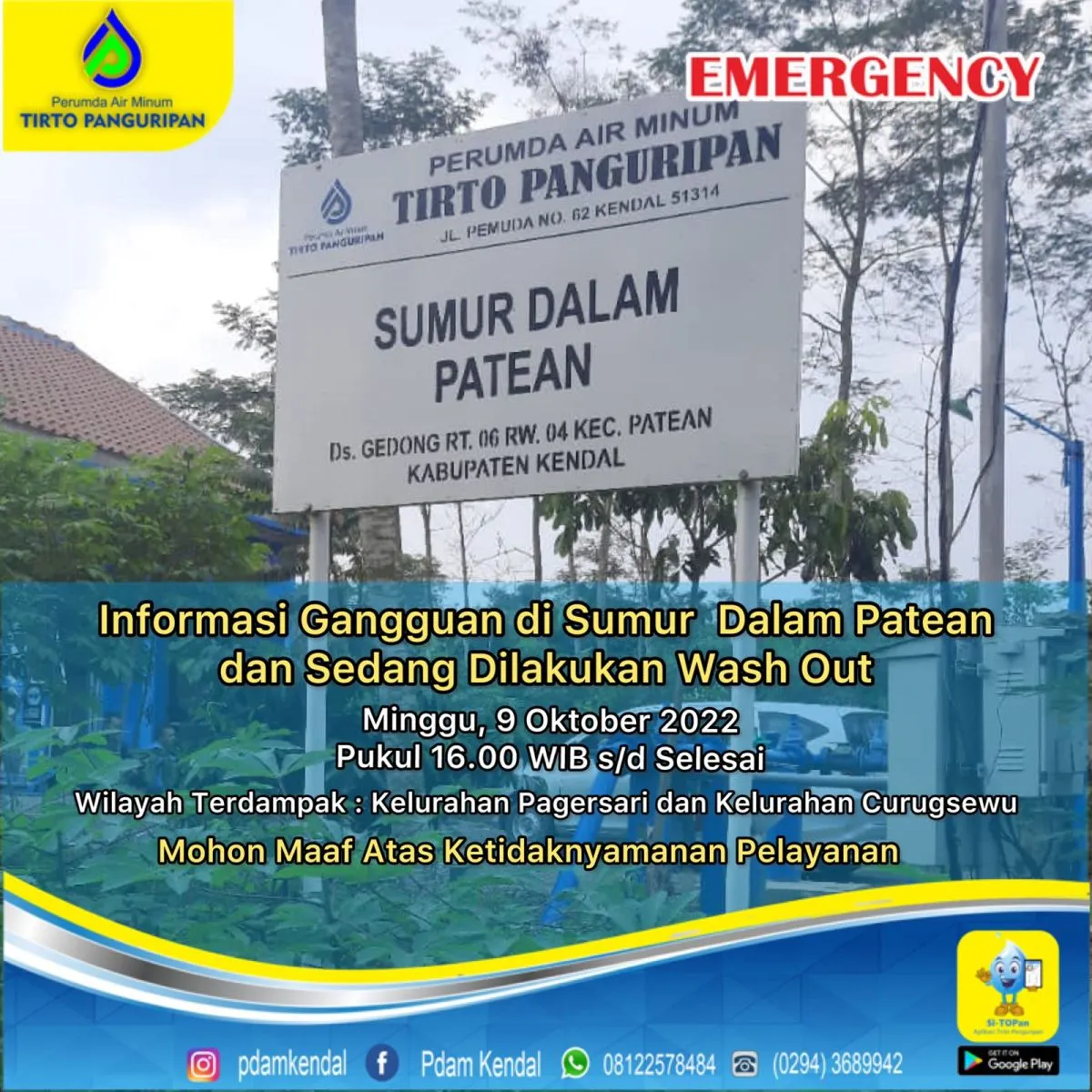 Sehubungan sedang dilaksanakan wash out (pencucian pipa) di Sumur Dalam Patean, mengakibatkan pelayanan terganggu di wilayah Pagersari dan Curugsewu.