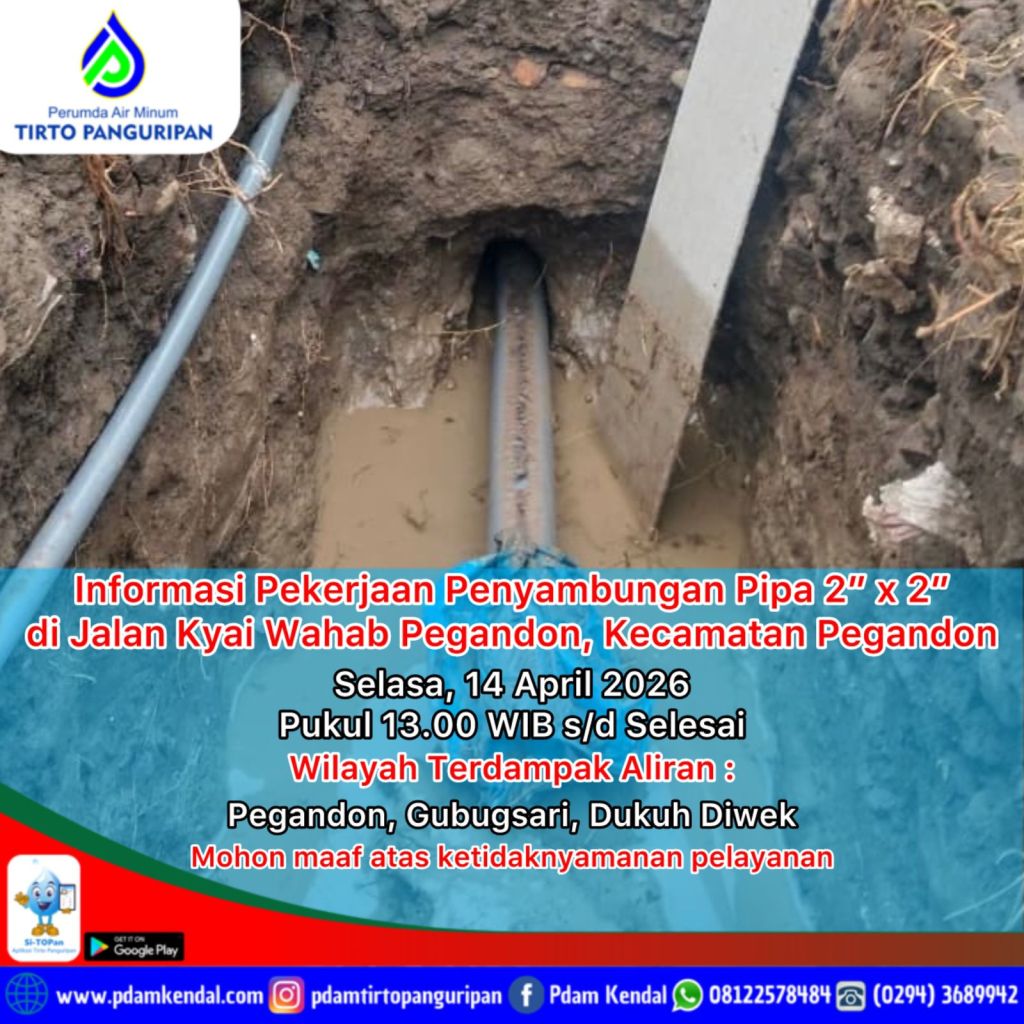 Informasi pekerjaan Penyambungan Pipa 2" x 2" di Jalan Kyai Wahab Pegandon, Kecamatan Pegandon.