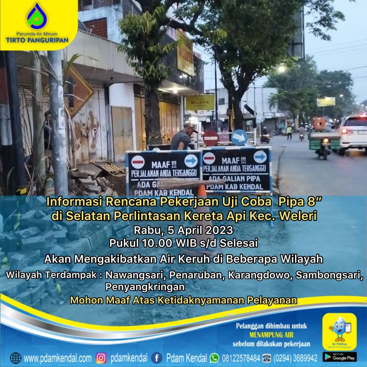 Informasi rencana pekerjaan uji coba pipa 8" di Selatan perlintasan rel kereta api Kec. Weleri Rabu, 5 April 2023, Pukul 10.00 WIB s/d selesai Hal tersebut akan mengakibatkan air keruh