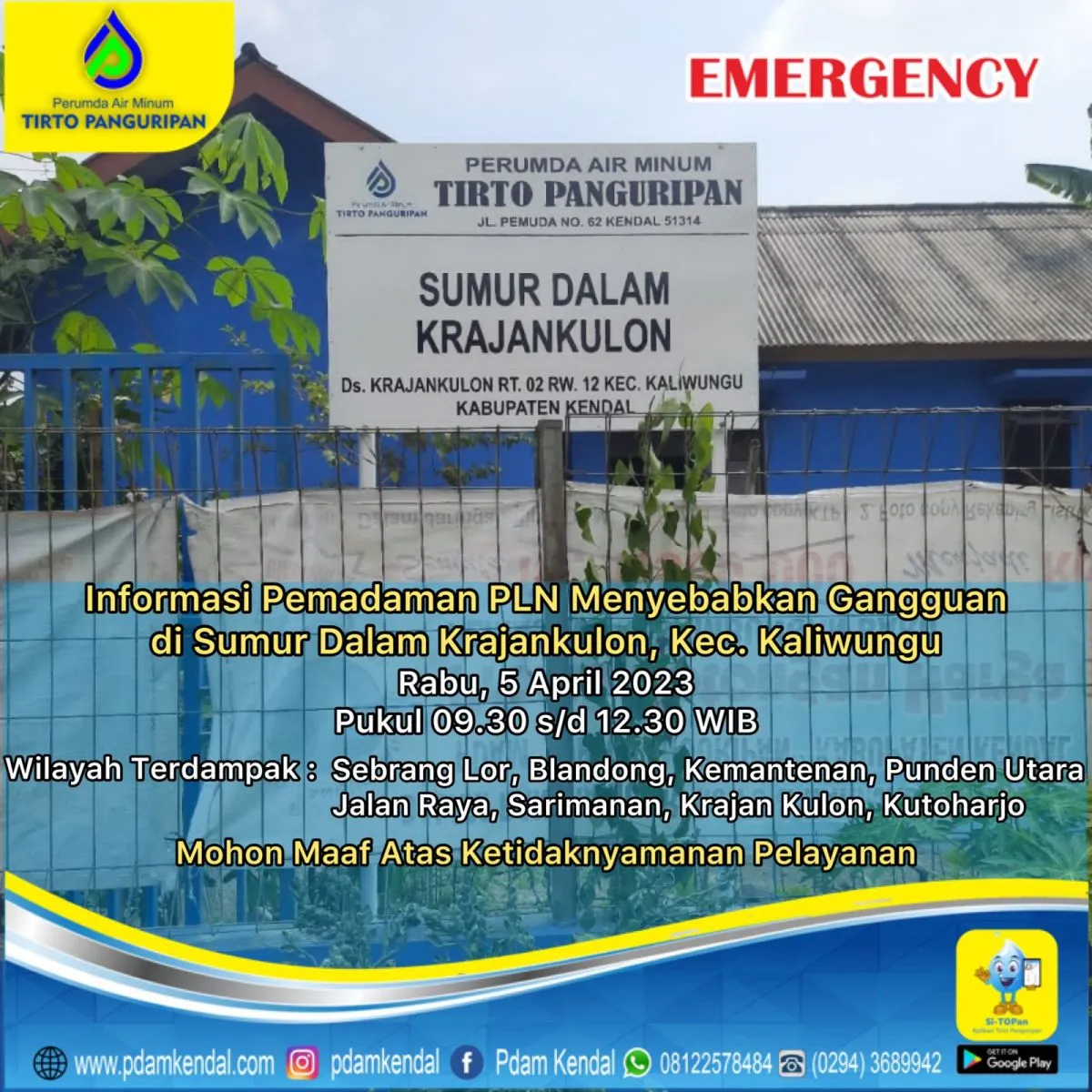 Informasi pemadaman dari PLN Rabu, 5 April 2023, pukul 09.30 s/d 12.30 WIB Akan menyebabkan gangguan di Sumur Dalam Krajankulon, Kec. Kaliwungu Hal tersebut akan mengakibatkan aliran terganggu