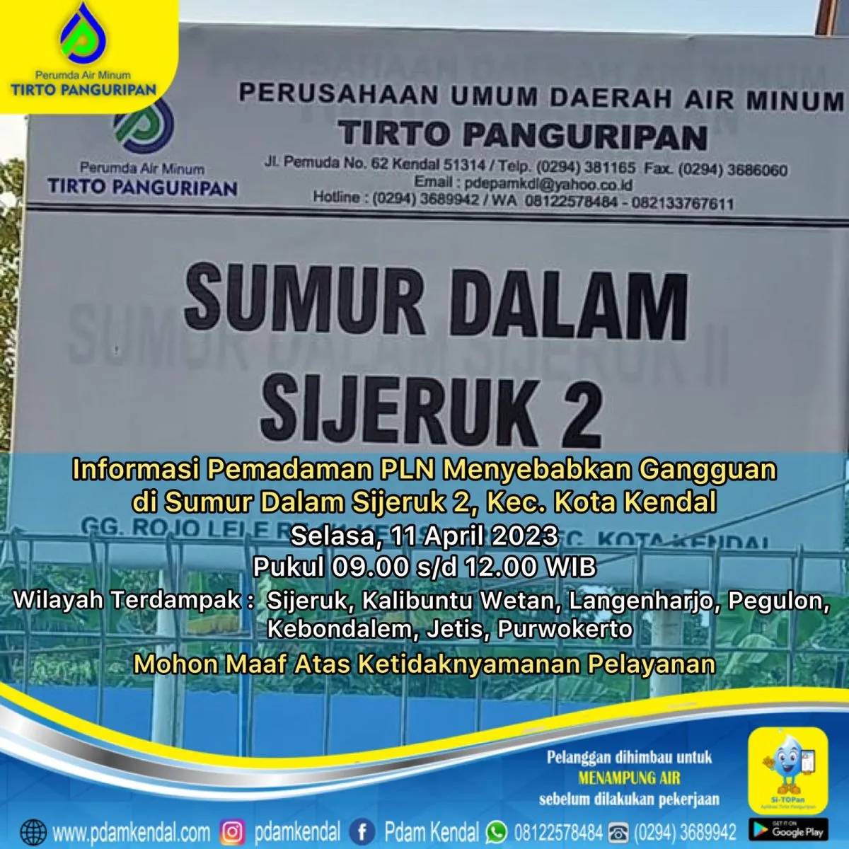 Informasi pemadaman PLN menyebabkan gangguan di Sumur Dalam Sijeruk 2, Kec. Kota Kendal Selasa, 11 April 2023, pukul 09.00 s/d 12.00 WIB Hal tersebut akan mengakibatkan aliran terganggu