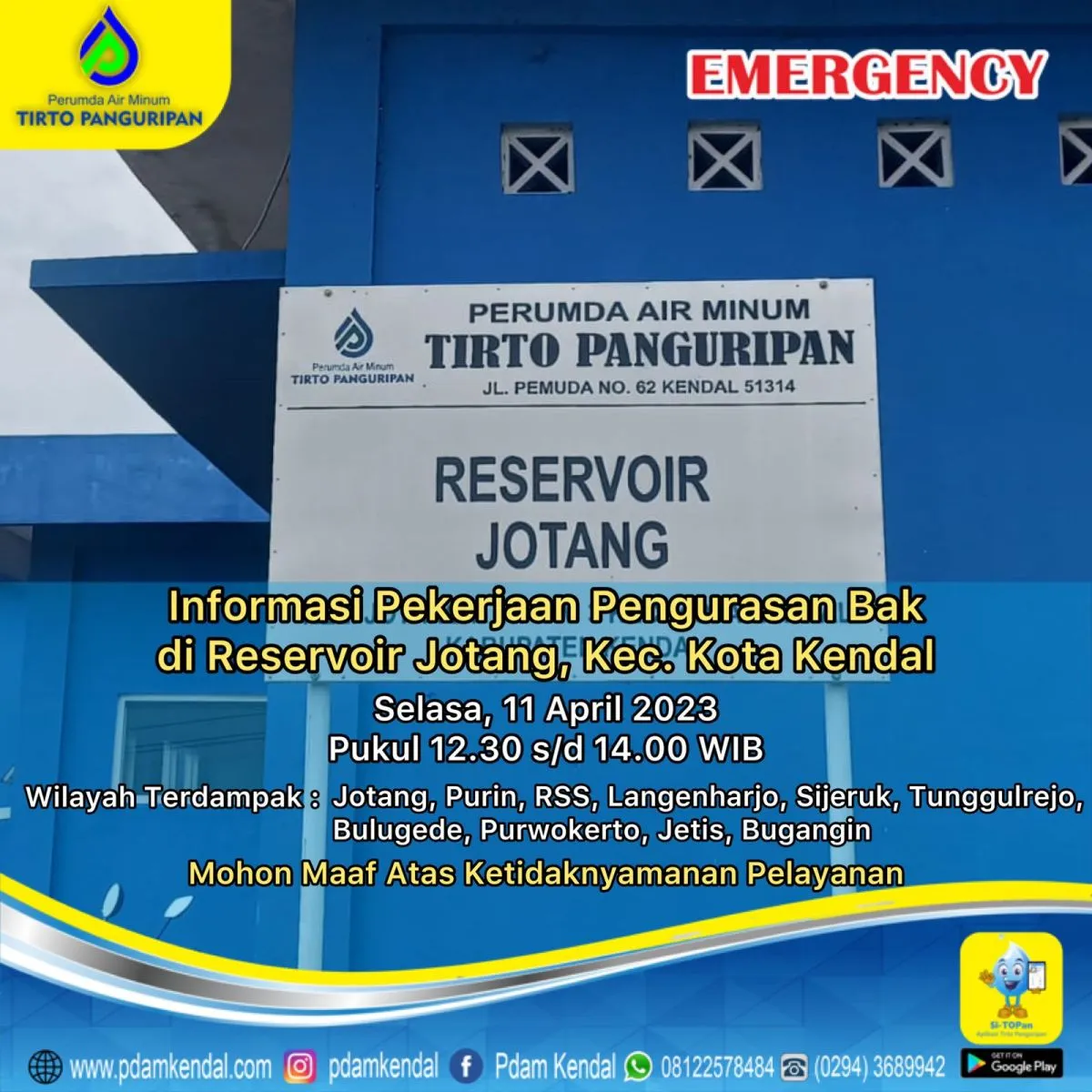 Informasi pekerjaan pengurasan bak di Reservoir Jotang, Kec. Kota Kendal Selasa, 11 April 2023, pukul 12.30 s/d 14.00 WIB Hal tersebut akan mengakibatkan aliran terganggu