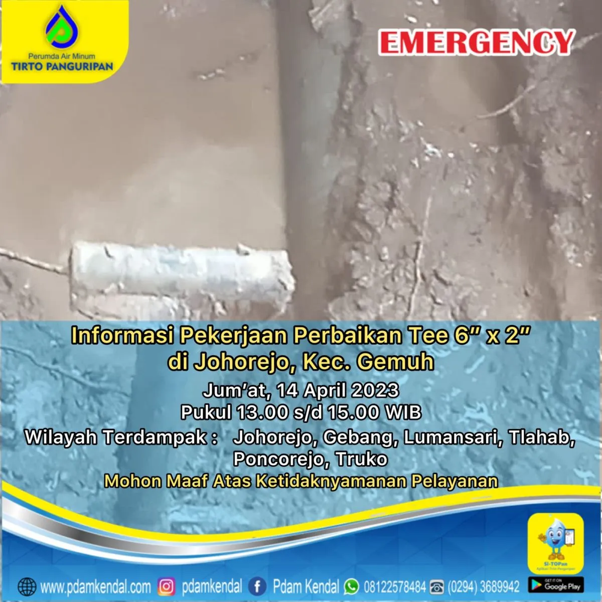 Informasi pekerjaan perbaikan Tee 6"x2" di Johorejo, Kec. Gemuh Jumat, 14 April 2023, pukul 13.00 s/d 15.00 WIB Hal tersebut akan mengakibatkan aliran terganggu