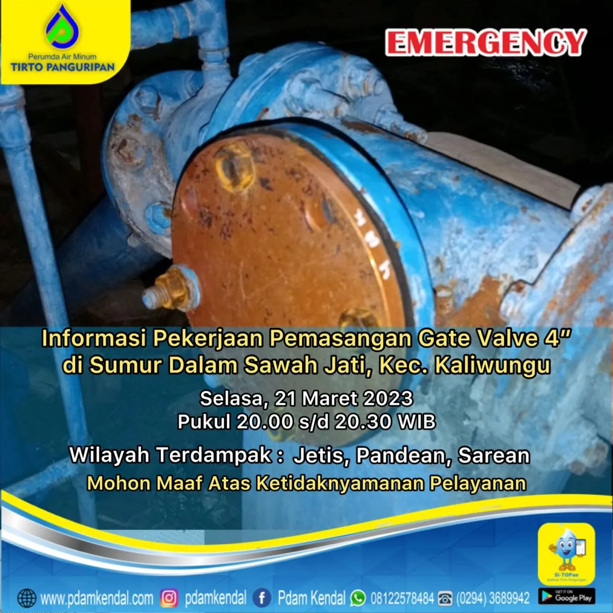 Informasi pekerjaan pemasangan gate valve 4" di Sumur Dalam Sawah Jati, Kec. Kaliwungu Selasa, 21 Maret 2023, pukul 20.00 s/d jam 20.30 WIB Hal tersebut akan menyebabkan aliran terganggu