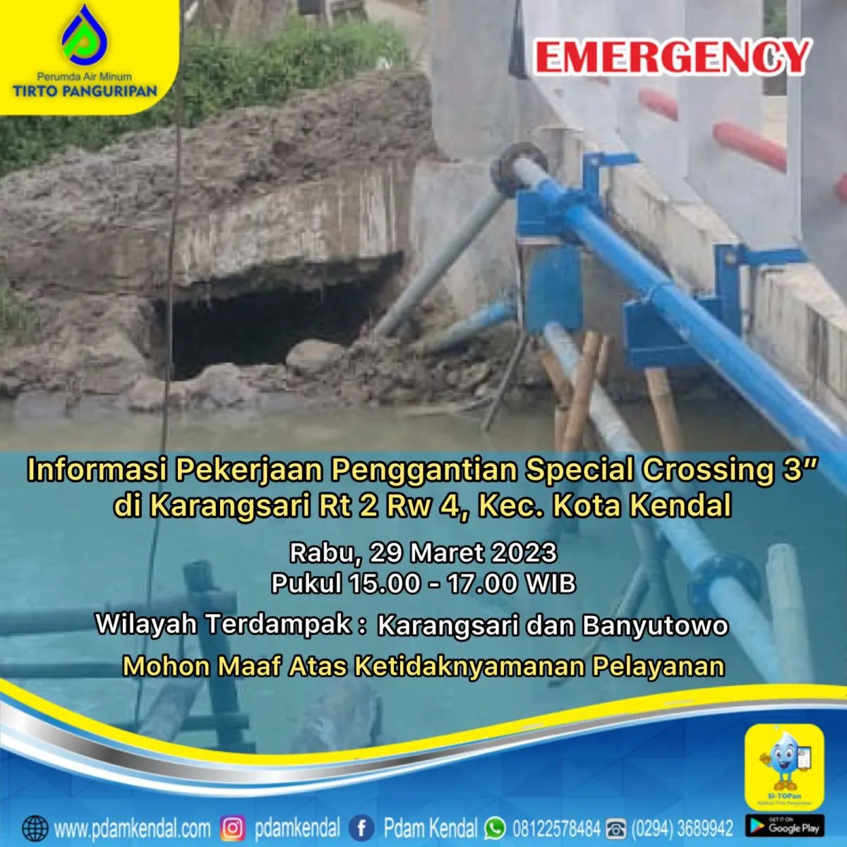 Informasi pekerjaan penggantian special crossing 3”, di Karangsari Rt 2 Rw 4, Kec. Kota Kendal Rabu, 29 Maret 2023, pukul 15.00 - 17.00 WIB Hal tersebut akan menyebabkan aliran terganggu