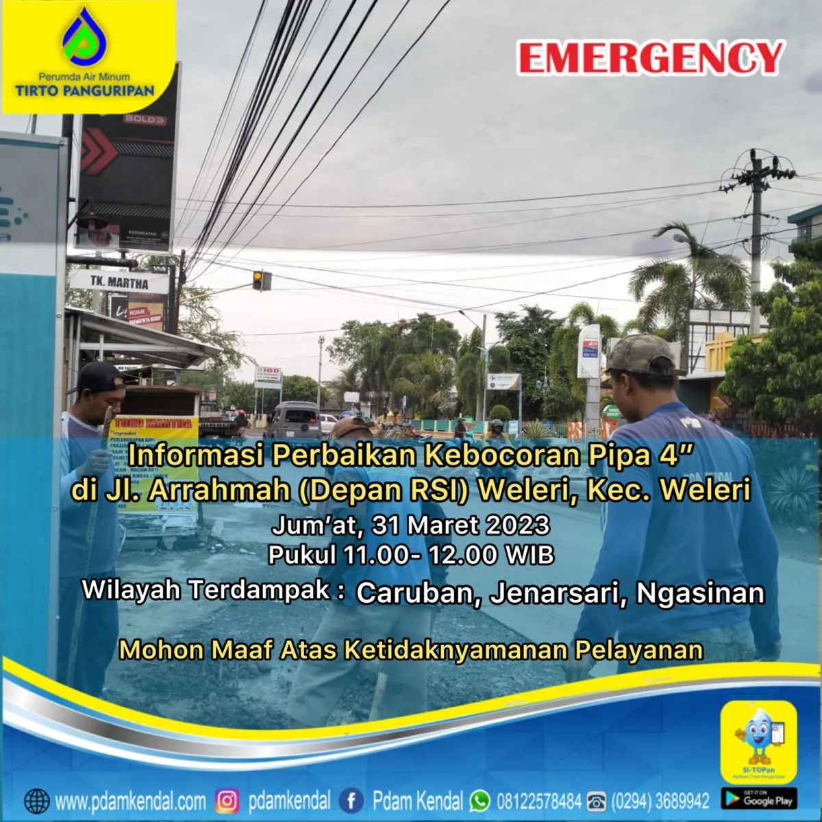 Informasi perbaikan kebocoran pipa 4” Di Jl. Arrahmah (Depan RSI) Weleri, Kec. Weleri Jum’at, 31 Maret 2023, ukul 11.00- 12.00 WIB Hal tersebut akan menyebabkan aliran terganggu