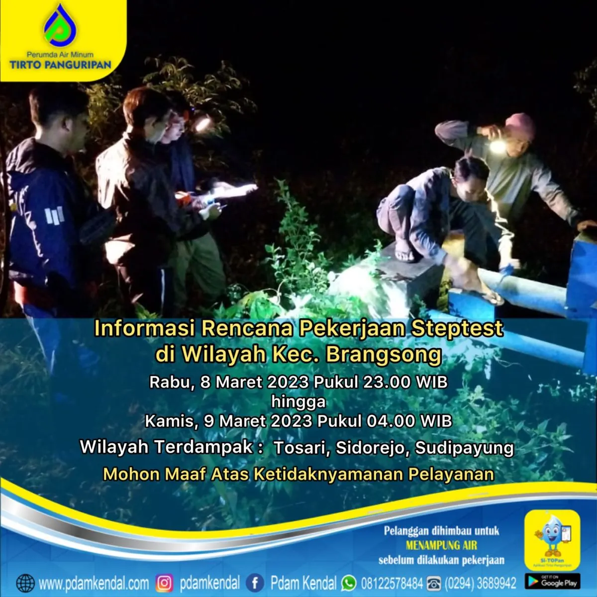Informasi rencana pekerjaan steptest di wilayah Kec. Brangsong Rabu, 8 Maret 2023, pukul 23.00 WIB hingga Kamis, 9 Maret 2023, pukul 04.00 WIB Hal tersebut akan menyebabkan aliran terganggu