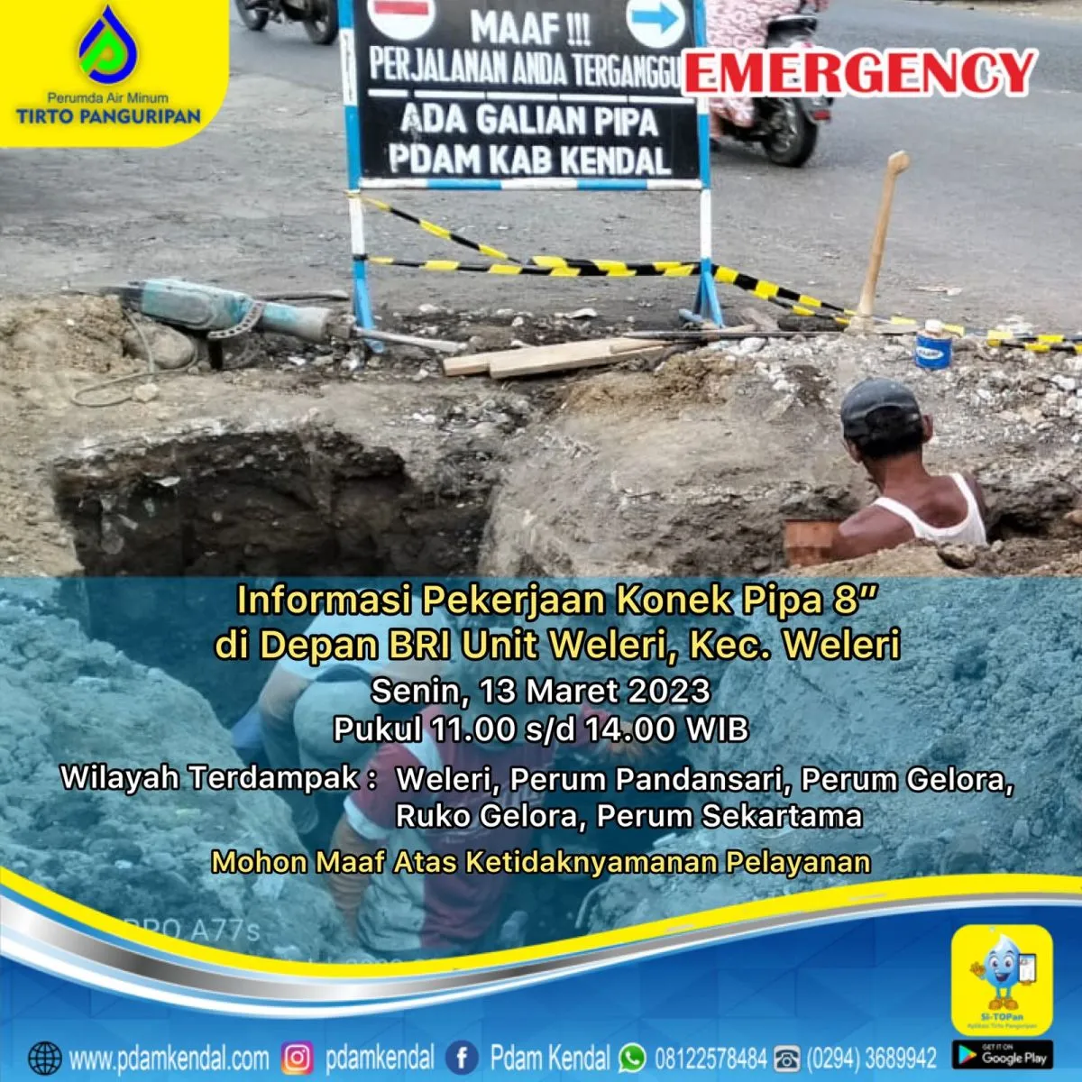 Informasi pekerjaan konek pipa 8” di Depan BRI Unit Weleri, Kec. Weleri Senin, 13 Maret 2023, pukul 11.00 s/d 14.00 WIB Hal tersebut akan menyebabkan aliran terganggu