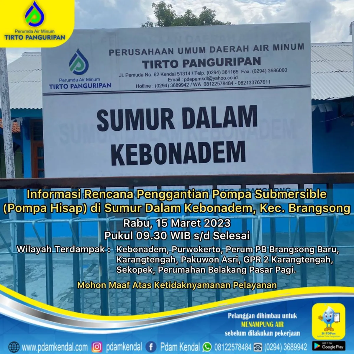 Informasi Rencana Penggantian Pompa Submersible (Pompa Hisap) di Sumur Dalam Kebonadem, Kec. Brangsong Rabu, 15 Maret 2023, pukul 09.30 WIB s/d Selesai Hal tersebut akan menyebabkan aliran terganggu