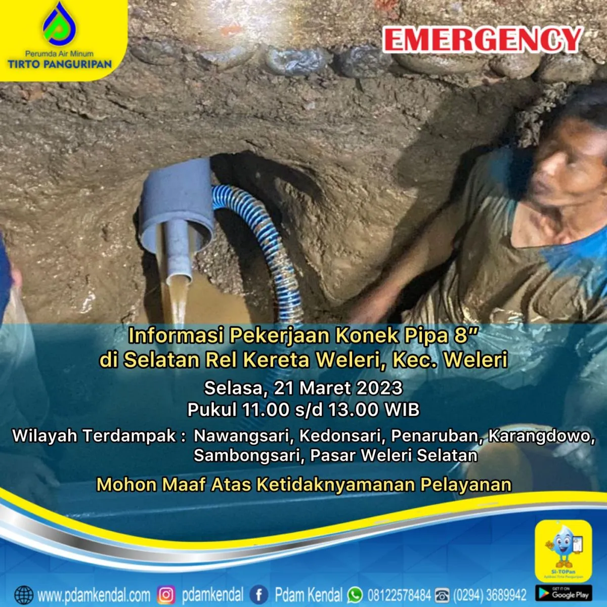 Informasi pekerjaan konek pipa 8” di selatan rel kereta Weleri, Kec. Weleri Selasa, 21 Maret 2023, pukul 11.00 s/d 13.00 WIB Hal tersebut akan menyebabkan aliran terganggu