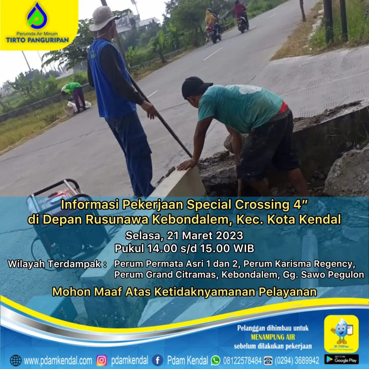 Informasi pekerjaan special crossing 4” di depan Rusunawa Kebondalem, Kec. Kota Kendal Selasa, 21 Maret 2023, pukul 14.00 s/d 15.00 WIB Hal tersebut akan menyebabkan aliran terganggu