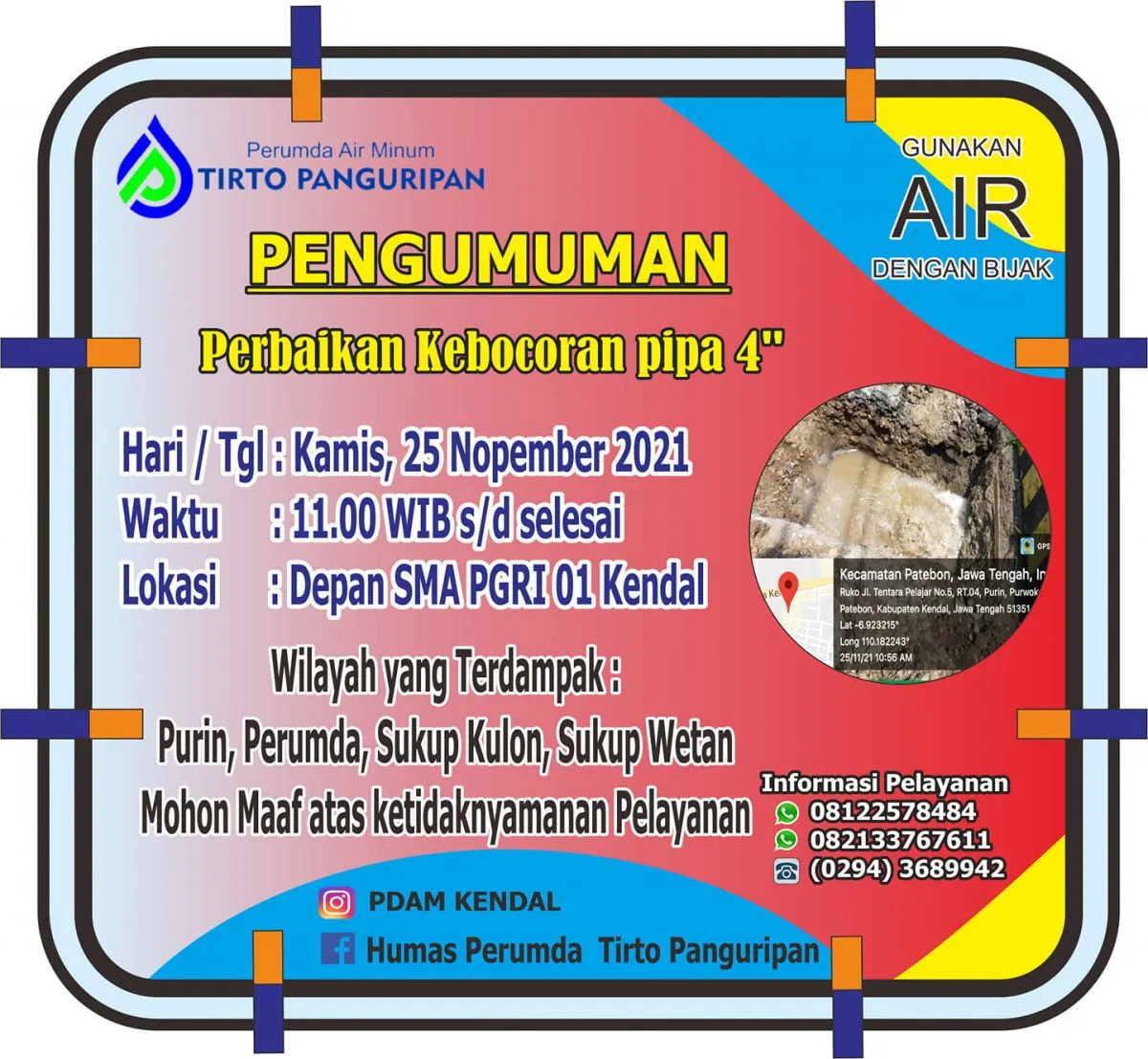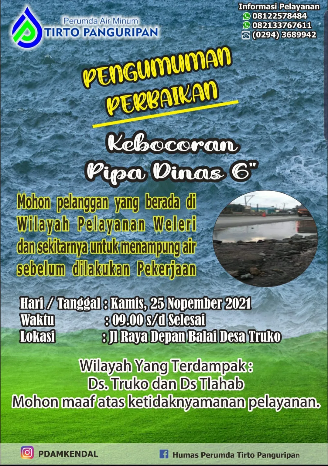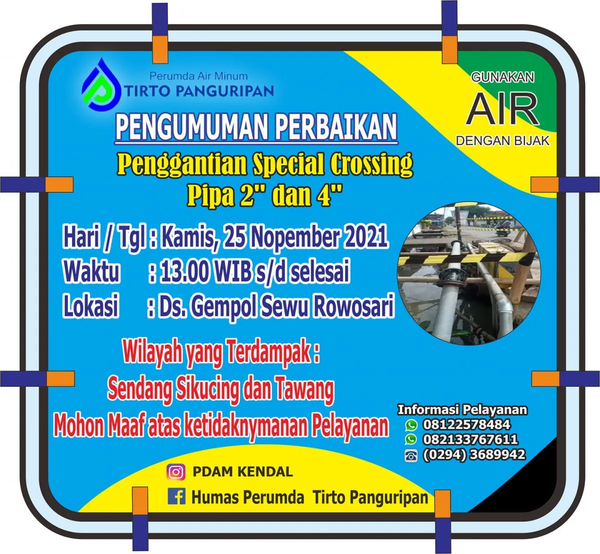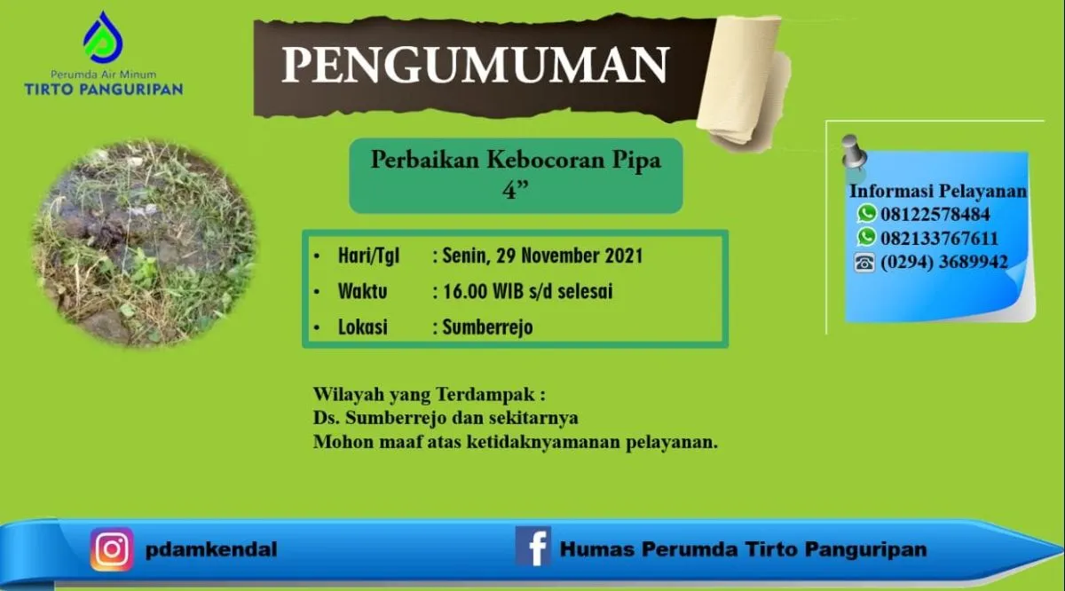 Informasi Gangguan Pelayanan untuk Pelanggan Perumda Air Minum Tirto Panguripan khususnya Pelayanan Wilayah Kendal Timur dan sekitarnya
