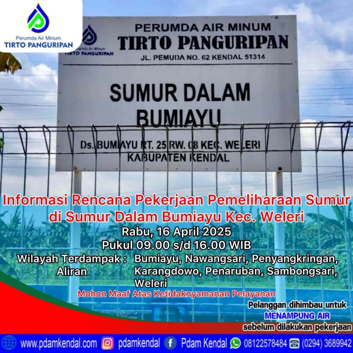 Informasi rencana pekerjaan pemeliharaan sumur di Sumur Dalam Bumiayu Kec. Weleri. Rabu, 16 April 2025, pukul 09.00 s/d 16.00 WIB. Hal tersebut akan menyebabkan aliran terganggu