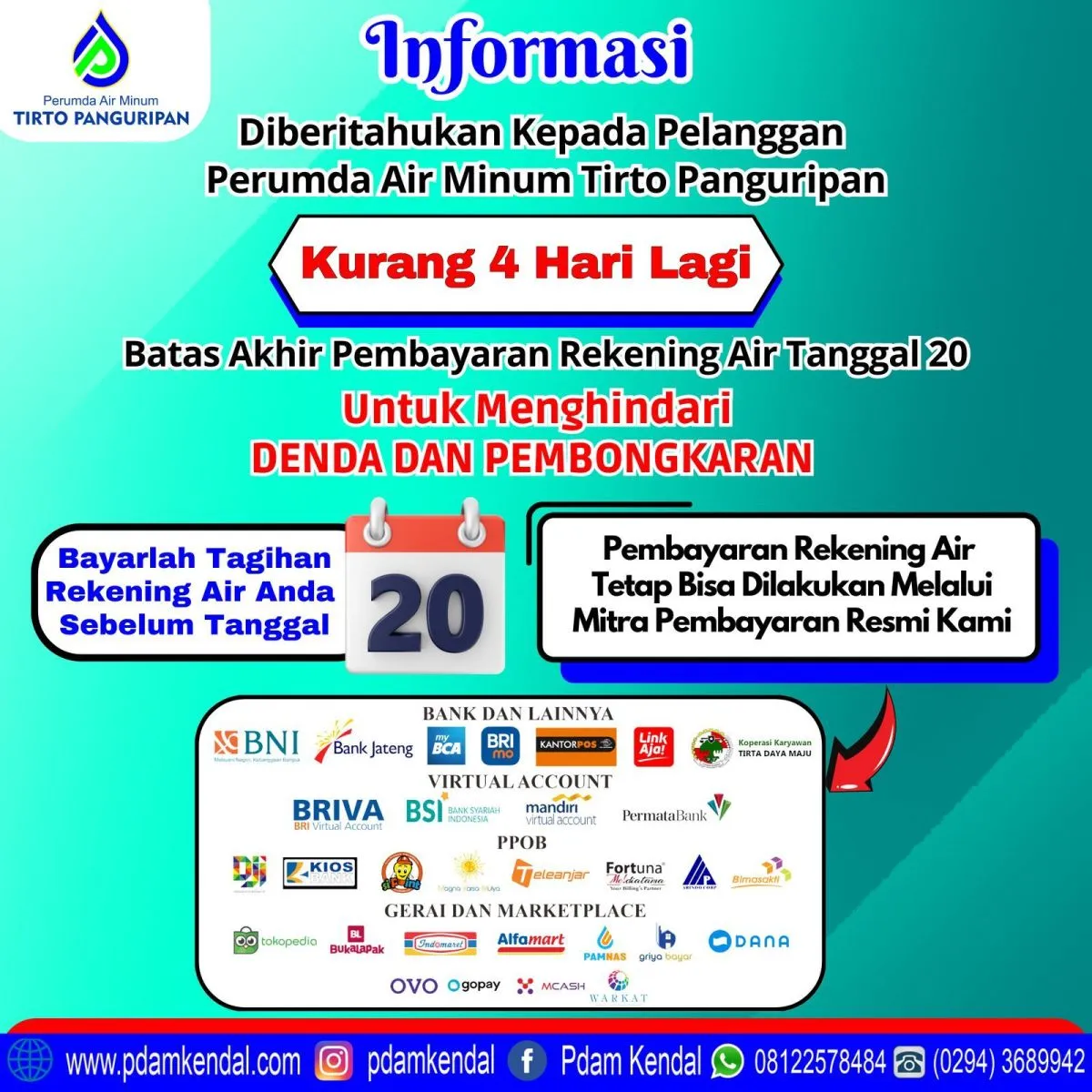 Informasi diberitahukan kepada pelanggan Perumda Air Minum Tirto Panguripan. Kurang 4 hari lagi. Batas akhir pembayaran rekening air tanggal 20. Untuk menghindari denda dan pembongkaran. Bayarlah tagihan rekening air anda sebelum tanggal 20. Pembayaran