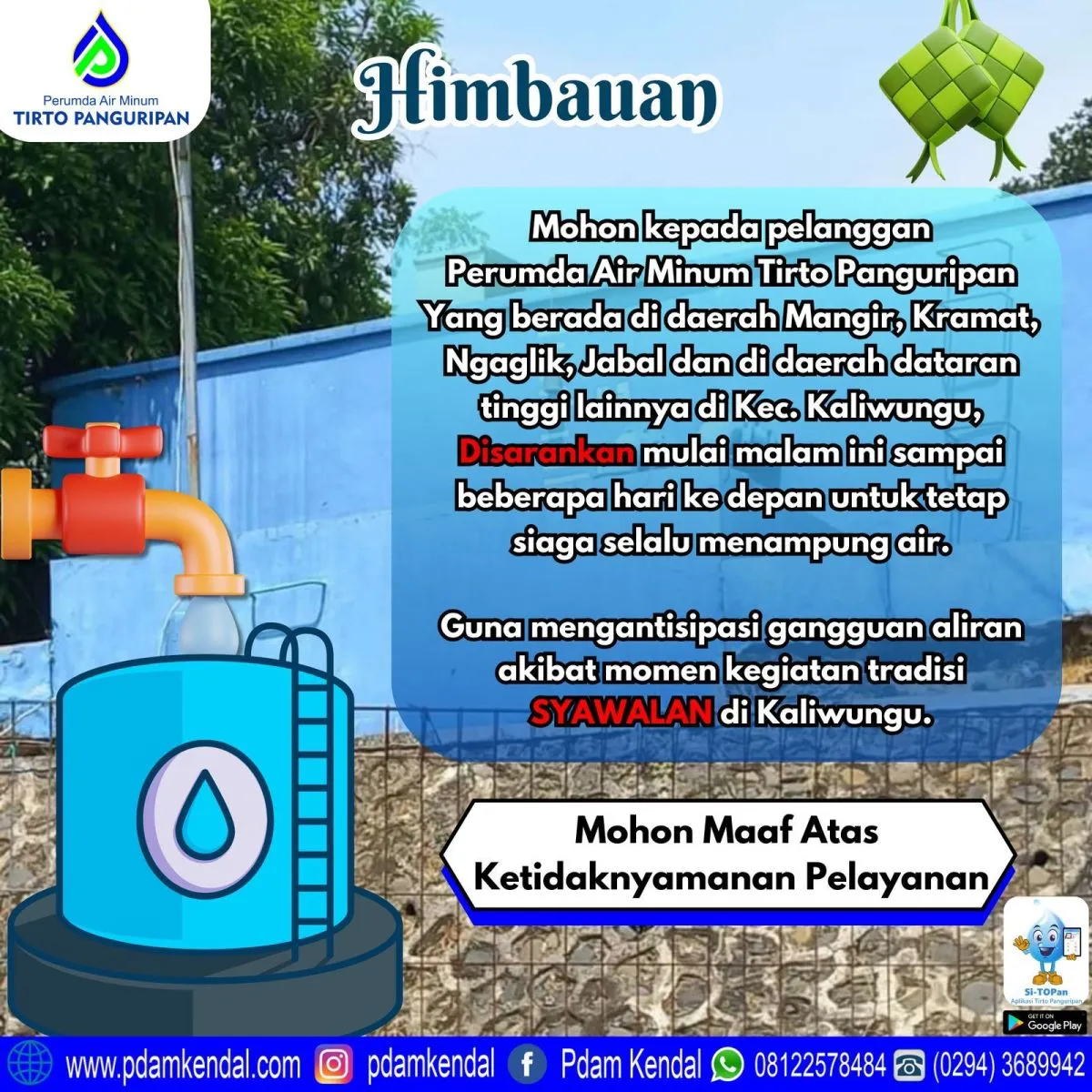 Himbauan mohon kepada pelanggan Perumda Air Minum Tirto Panguripan. Yang berada di daerah Mangir, Kramat, Ngaglik, Jabal, dan di daerah dataran tinggi lainnya di Kec. Kaliwungu. Disarankan mulai malam ini hingga tiga hari ke depan untuk tetap siaga selalu menampung air. Guna mengantisipasi gangguan aliran akibat moment kegiatan tradisi SYAWALAN