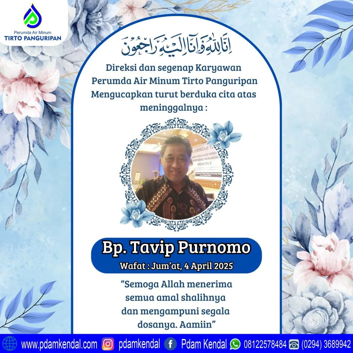 Innalillahi wa Innaillahi Rozi’un. Direksi dan segenap Karyawan Perumda Air Minum Tirto Panguripan. Mengucapkan turut berduka cita atas meninggalnya : Bp. Tavip Purnomo Wafat : Jum’at, 4 April 2025 “Semoga Allah menerima semua amal shalihnya dan mengam