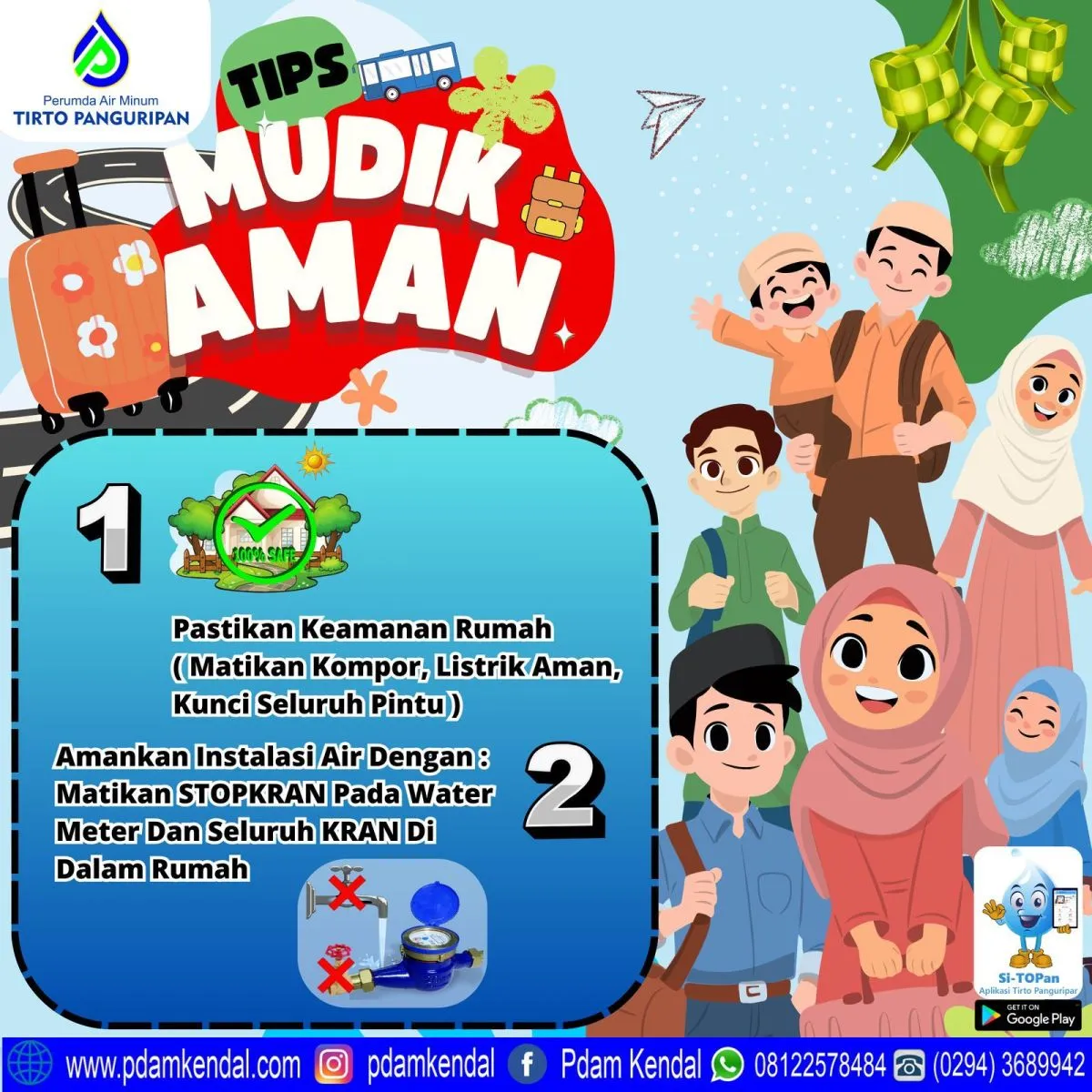 Tips mudik aman : 1. Pastikan keamanan rumah (matikan kompor, listrik aman, kunci seluruh pintu). 2. Amankan instalasi air dengan matikan stopkran pada water meter dan seluruh kran di dalam rumah.