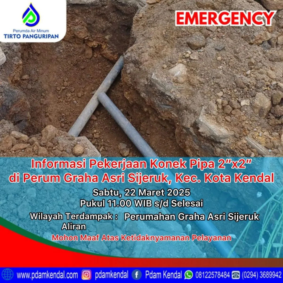 Informasi pekerjaan konek pipa 2”x2” di Perum Graha Asri Sijeruk, Kec. Kota Kendal. Sabtu, 22 Maret 2025, pukul 11.00 WIB s/d selesai. Hal tersebut akan menyebabkan aliran terganggu