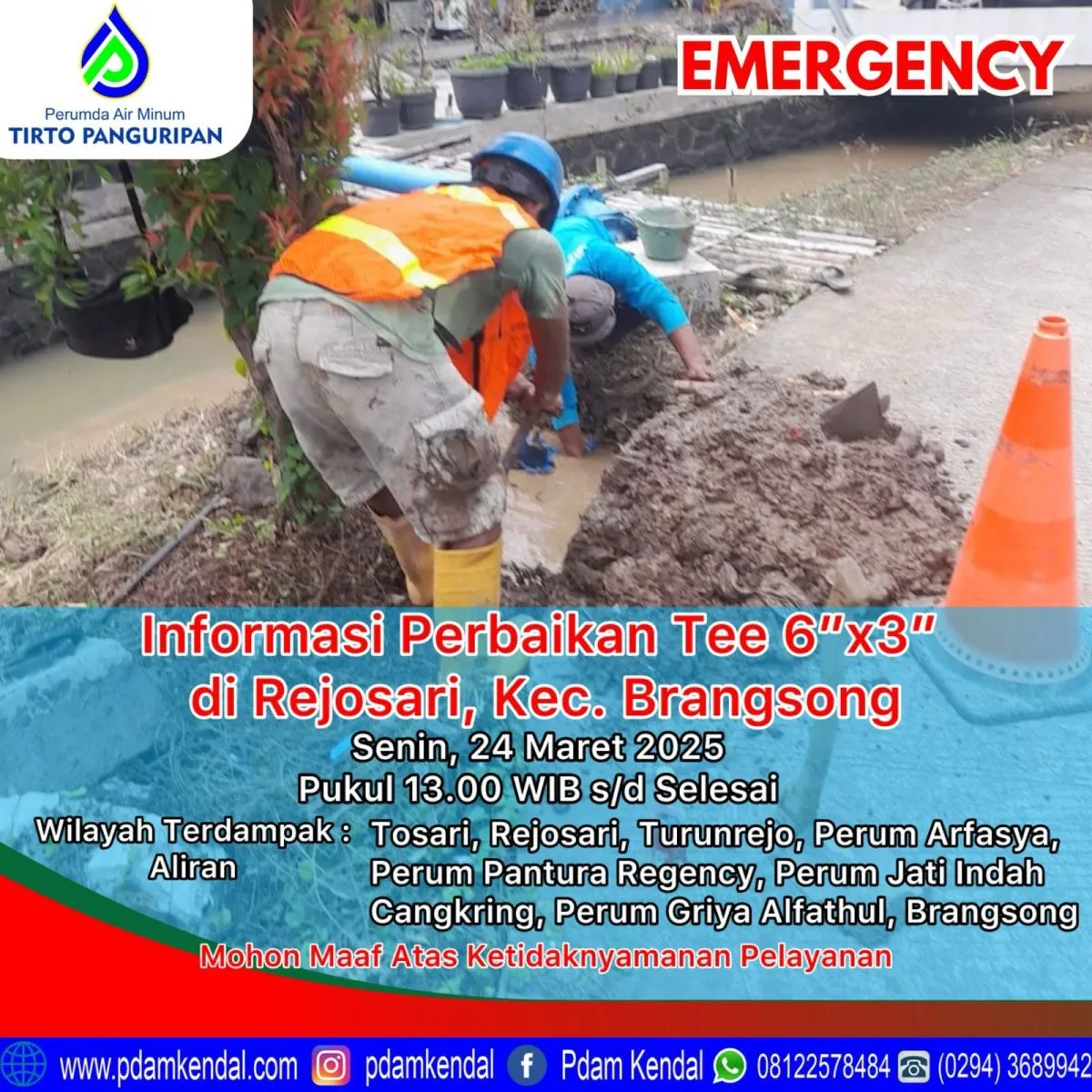 Informasi perbaikan tee 6”x3” di Rejosari, Kec. Brangsong. Senin, 24 Maret 2025, pukul 13.00 WIB s/d selesai. Hal tersebut menyebabkan aliran terganggu