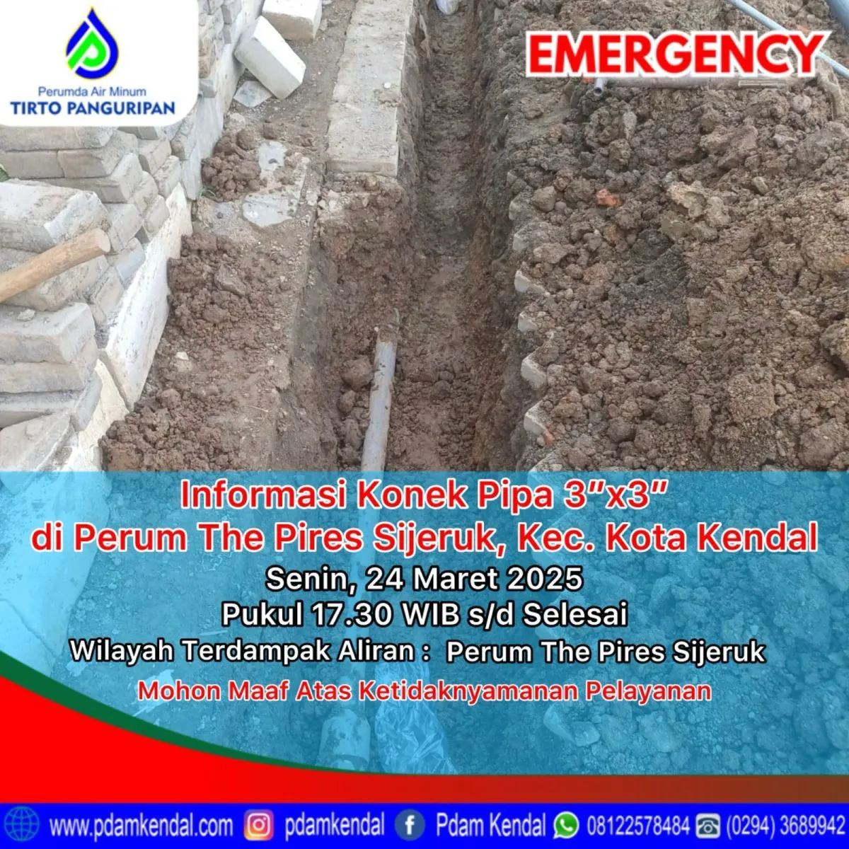 Informasi konek pipa 3”x3” di Perum The Pires Sijeruk, Kec. Kota Kendal. Senin, 24 Maret 2025, pukul 17.30 WIB s/d selesai. Hal tersebut menyebabkan aliran terganggu