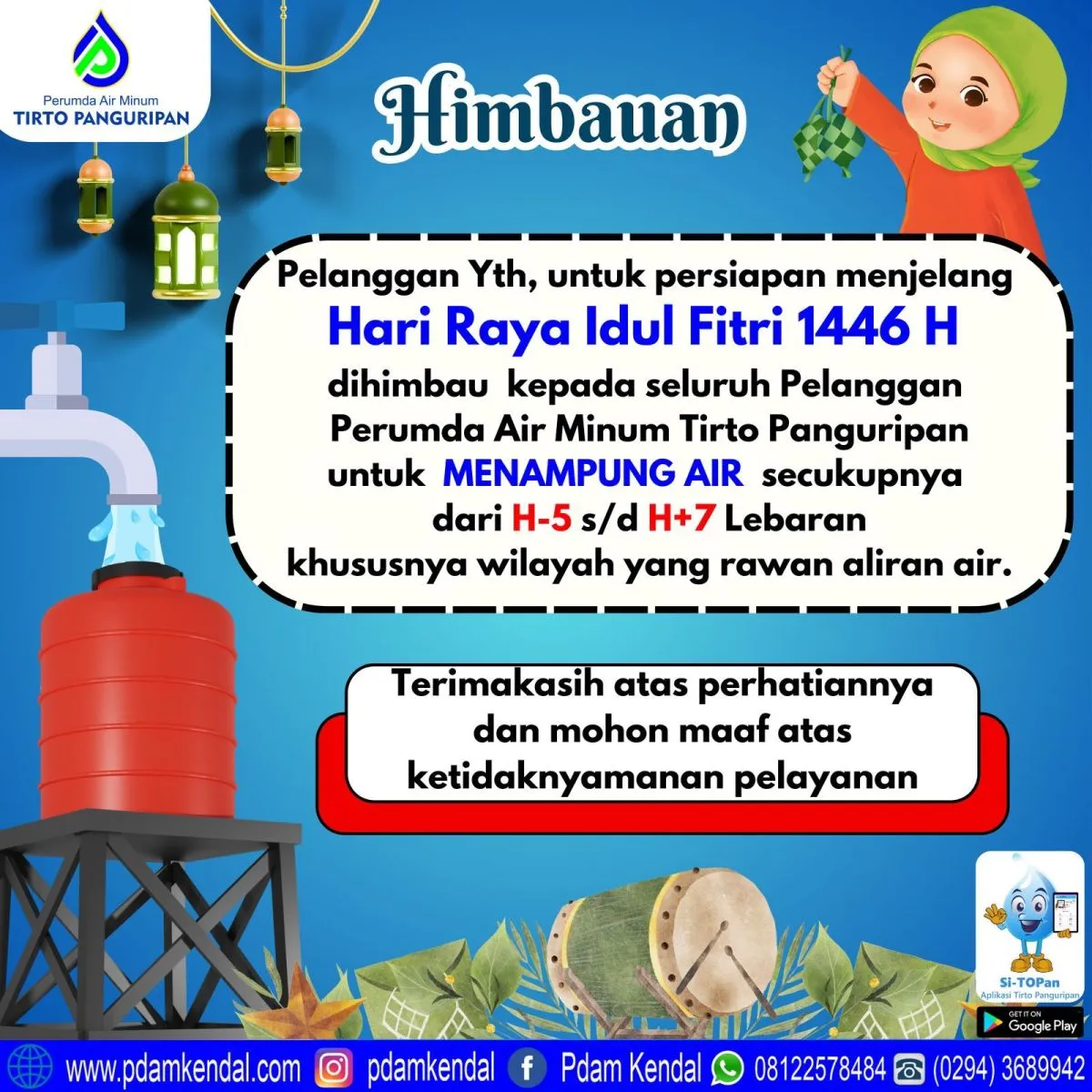 Pelanggan Yth, untuk persiapan menjelang Hari Raya Idul Fitri 1446 H. Dihimbau kepada seluruh Pelanggan Perumda Air Minum Tirto Panguripan untuk MENAMPUNG AIR secukupnya dari H-5 s/d H+7 Lebaran.