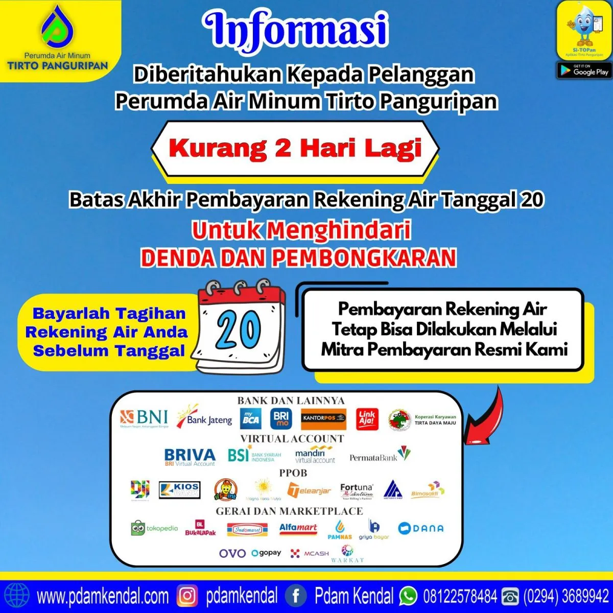 Informasi diberitahukan kepada pelanggan Perumda Air Minum Tirto Panguripan. Kurang 2 hari lagi. Batas akhir pembayaran rekening air tanggal 20. Untuk menghindari denda dan pembongkaran. Bayarlah tagihan rekening air anda sebelum tanggal 20. Pembayaran