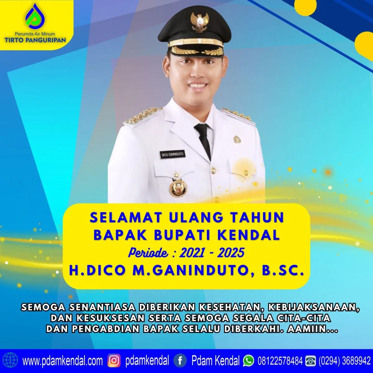 Segenap jajaran direksi beserta karyawan Perumda Air Minum Tirto Panguripan mengucapkan : Selamat Ulang Tahun Bapak Bupati Kendal Periode : 2021 - 2025 H. Dico M. Ganinduto, B.SC.
