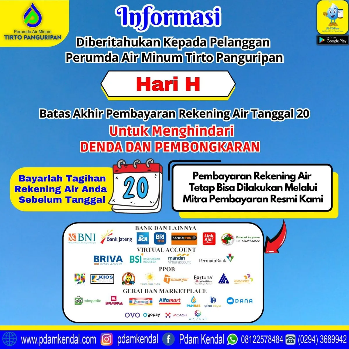 Informasi diberitahukan kepada pelanggan Perumda Air Minum Tirto Panguripan. Hari H Batas akhir pembayaran rekening air tanggal 20. Untuk menghindari denda dan pembongkaran. Bayarlah tagihan rekening air anda sebelum tanggal 20. Pembayaran rekening air