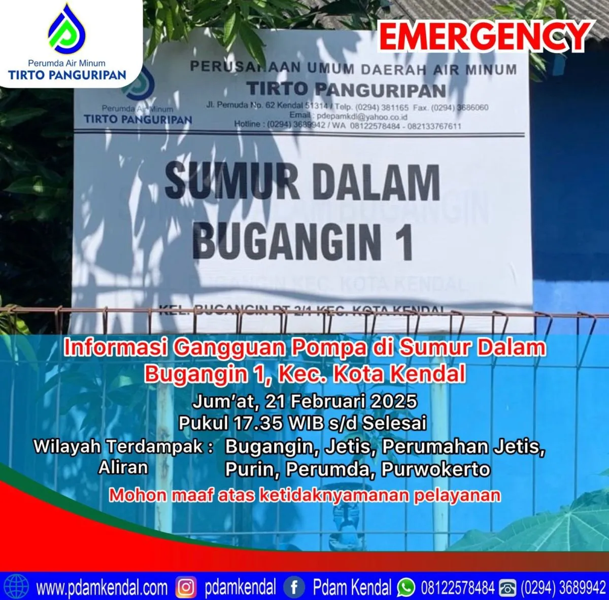 Informasi gangguan pompa di Sumur Dalam Bugangin 1, Kec. Kota Kendal. Jumat, 21 Februari 2025, pukul 17.35 WIB s/d selesai. Hal tersebut menyebabkan aliran terganggu