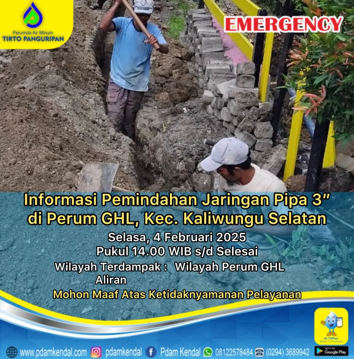Informasi pemindahan jaringan pipa 3” di Perum GHL, Kec. Kaliwungu Selatan. Selasa, 4 Februari 2025, pukul 14.00 WIB s/d selesai. Hal tersebut akan menyebabkan aliran terganggu