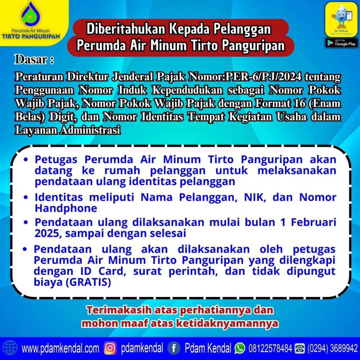 Diberitahukan Kepada Pelanggan Perumda Air Minum Tirto Panguripan Dasar : Peraturan Direktur Jenderal Pajak Nomor:PER-6/PJ/2024 tentang Penggunaan Nomor Induk Kependudukan sebagai Nomor Pokok Wajib Pajak, Nomor Pokok Wajib Pajak dengan Format 16 (Enam Belas) Digit, dan Nomor Identitas Tempat Kegiatan Usaha dalam Layanan Administrasi.
