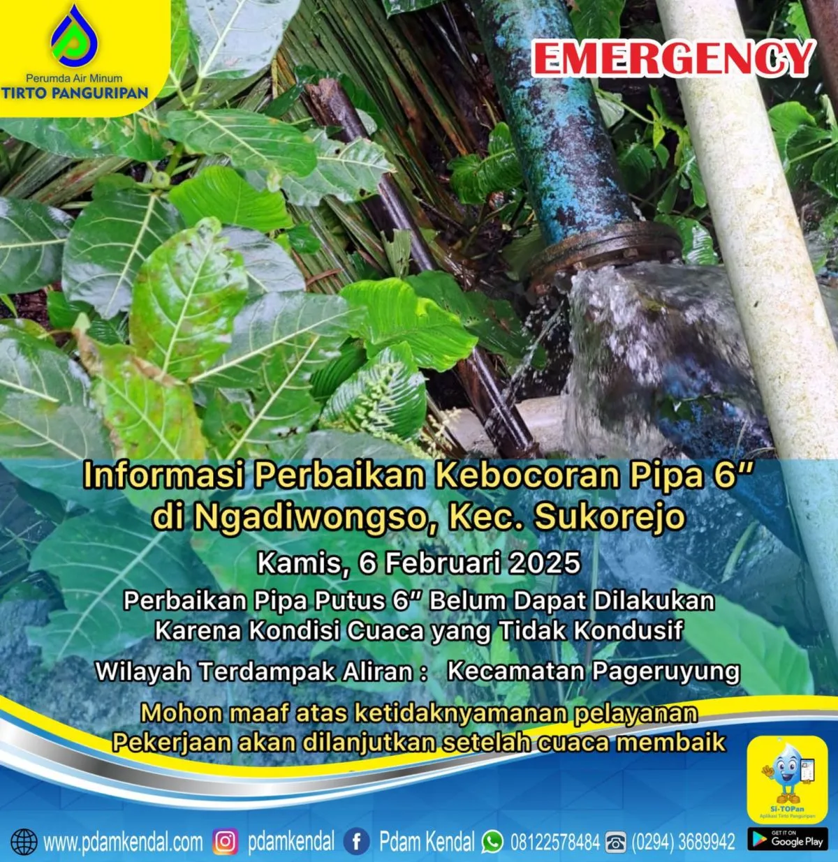 Informasi perbaikan kebocoran pipa 6” di Ngadiwongso, Kec. Sukorejo. Kamis, 6 Februari 2025. Perbaikan pipa putus belum dapat dilakukan. Karena kondisi cuaca yang tidak kondusif. Hal tersebut menyebabkan aliran terganggu