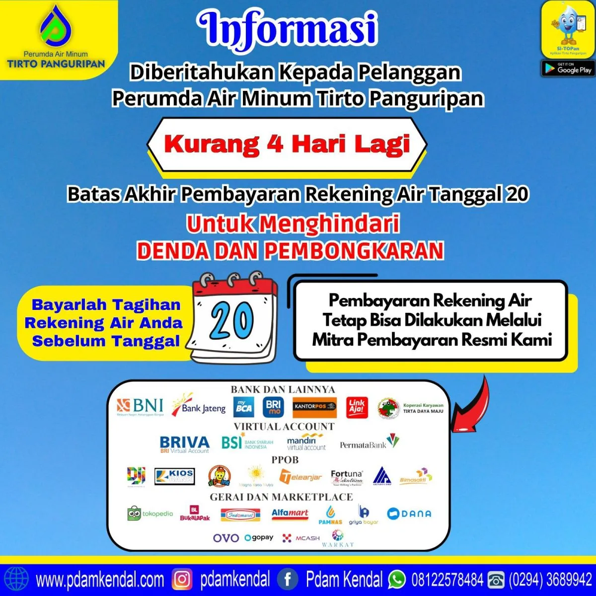 Informasi diberitahukan kepada pelanggan Perumda Air Minum Tirto Panguripan. Kurang 4 hari lagi. Batas akhir pembayaran rekening air tanggal 20. Untuk menghindari denda dan pembongkaran. Bayarlah tagihan rekening air anda sebelum tanggal 20. Pembayaran