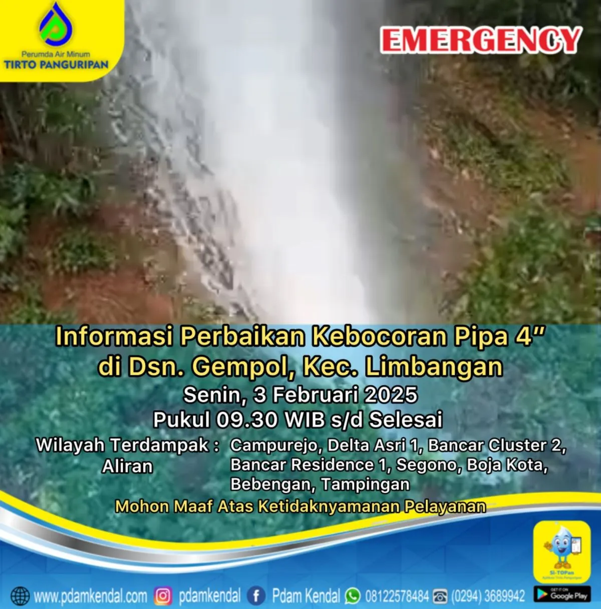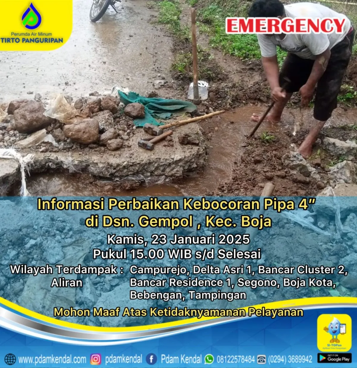 Informasi perbaikan kebocoran pipa 4” di Dsn. Gempol, Kec. Boja. Kamis, 23 Januari 2025, pukul 15.00 WIB s/d selesai. Hal tersebut menyebabkan aliran terganggu