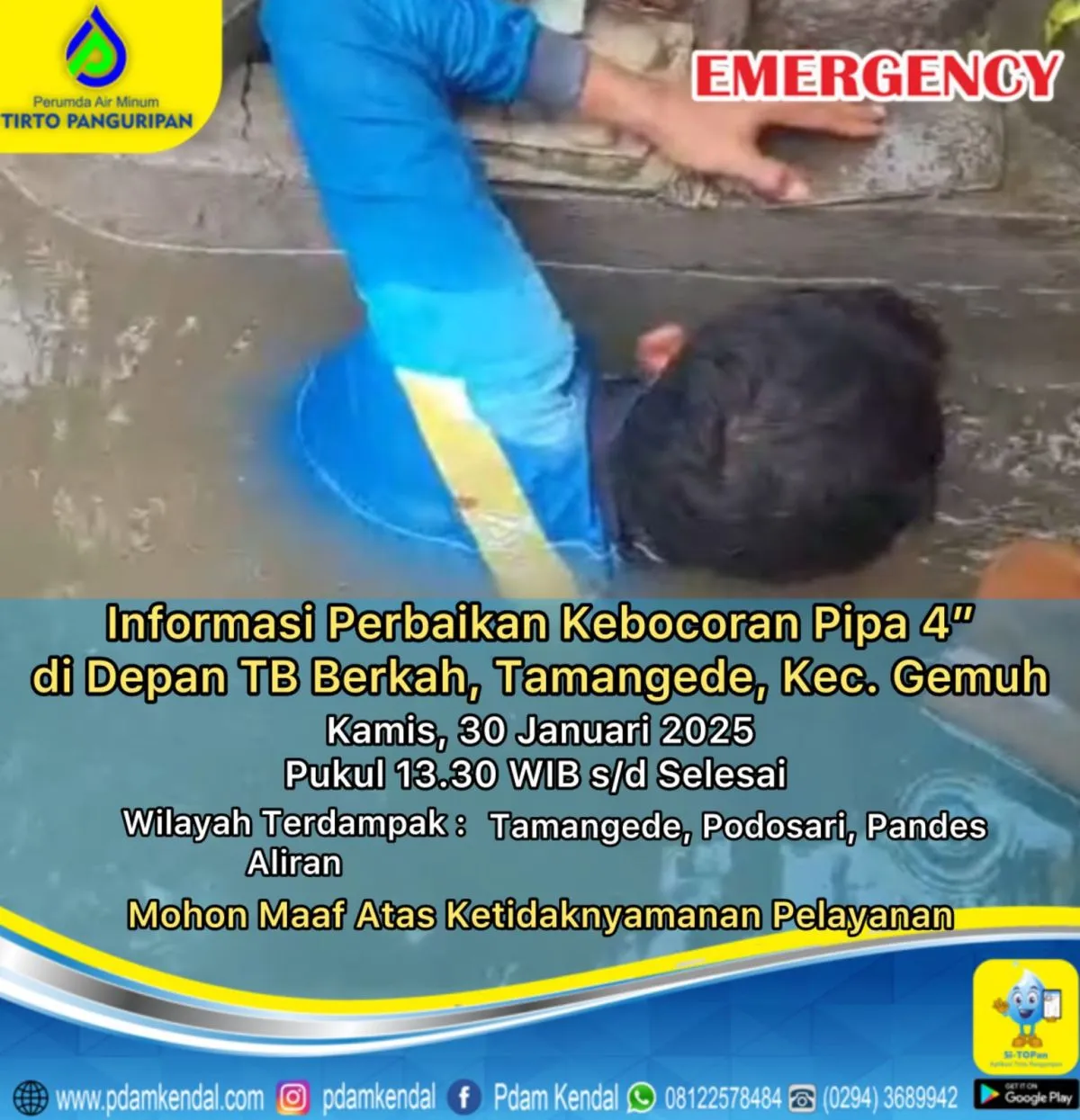 Informasi perbaikan pipa 4” di depan TB Berkah, Tamangede, Kec. Gemuh. Kamis, 30 Januari 2025, pukul 13.30 WIB s/d selesai. Hal tersebut menyebabkan aliran terganggu